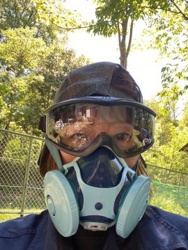 二重の手袋・マスクにゴーグルと完全防備で、周辺にばら撒きままぁ〜す( ̄^ ̄)ゞ