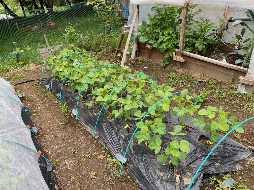 最初に植えた枝豆も、背丈が伸びて、不織布を外す。。