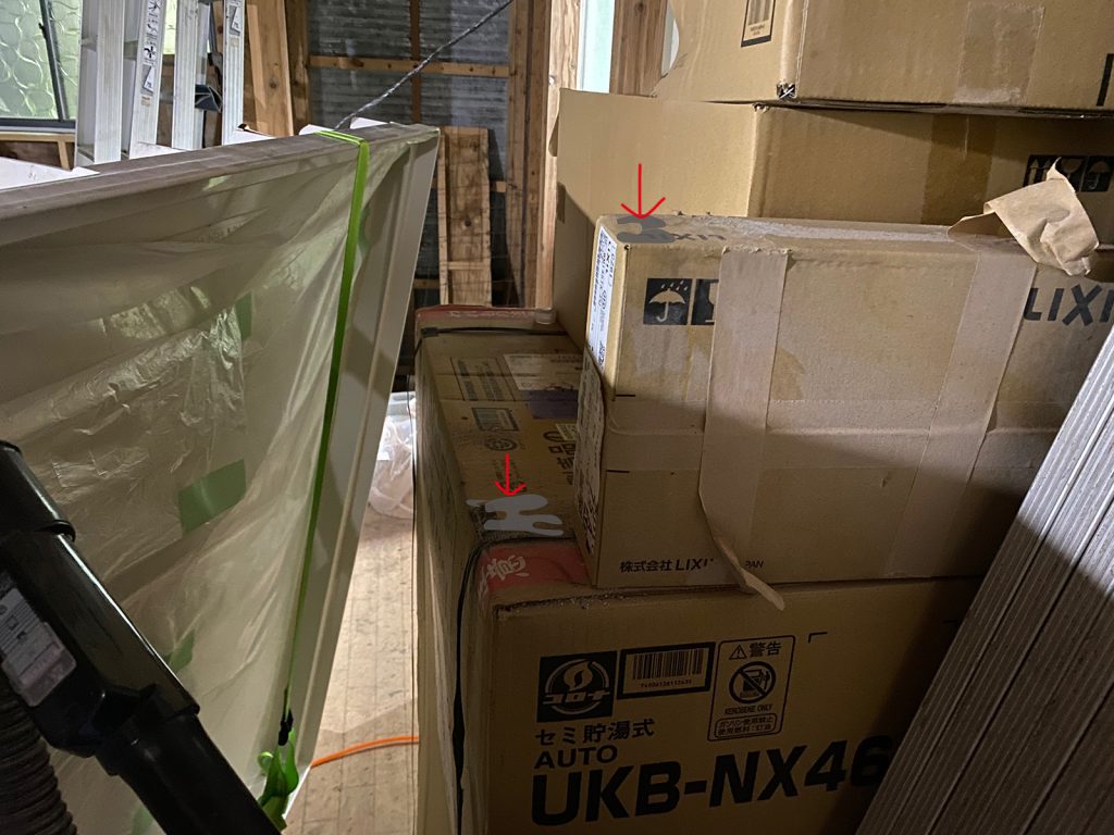 上の段ボールの灰色のところに、、、、しかも、上と下(≧△≦)