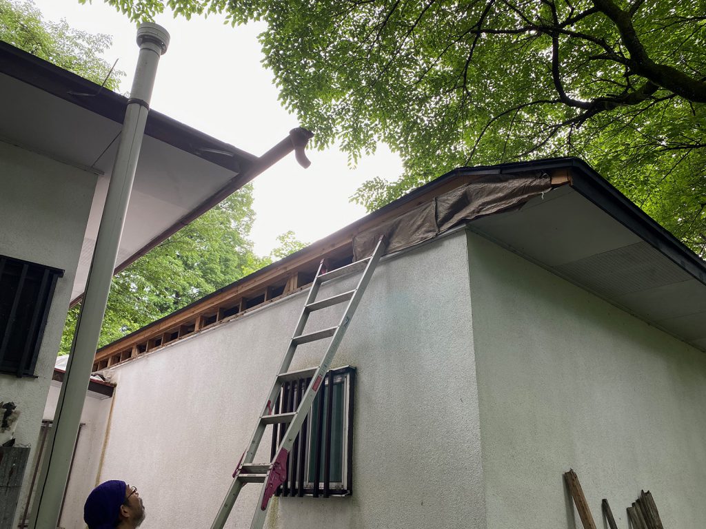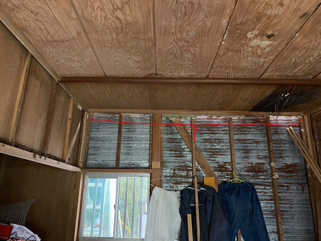 作業場の軒天(↑)開いたままなので、ここから、例の獣が出入りしてたらしい(- -;;)