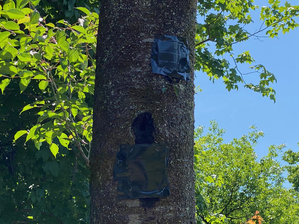 以前、キツツキにやられた穴__、詰め込んだ新聞は、鳥に外され、