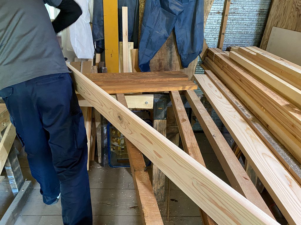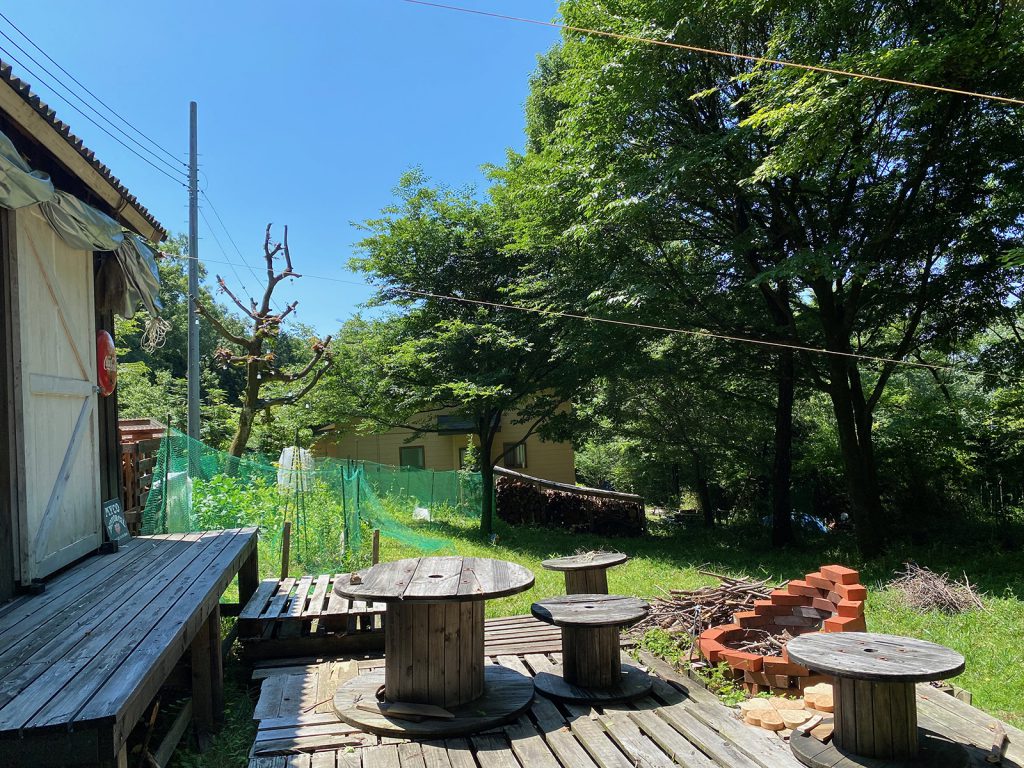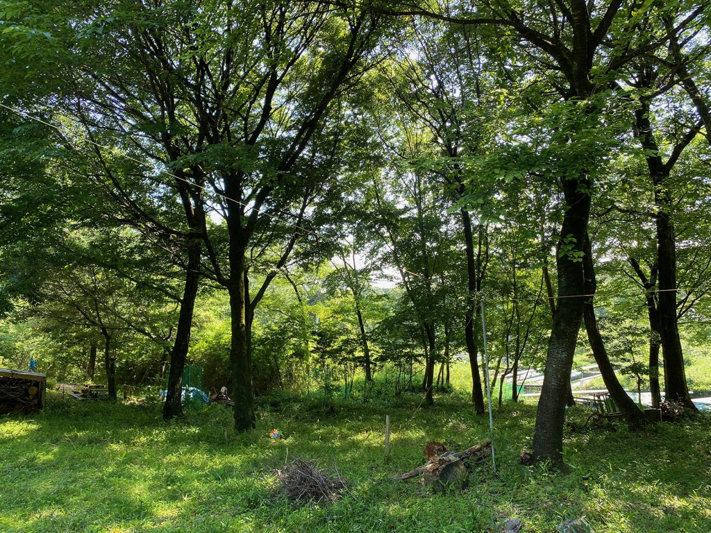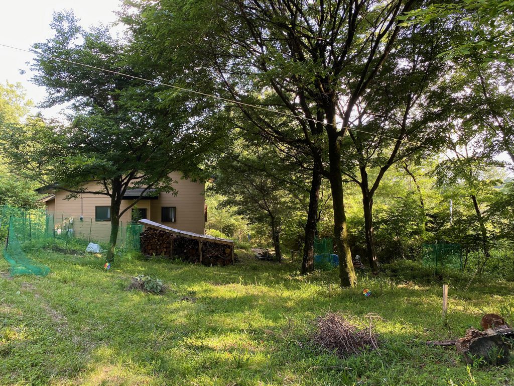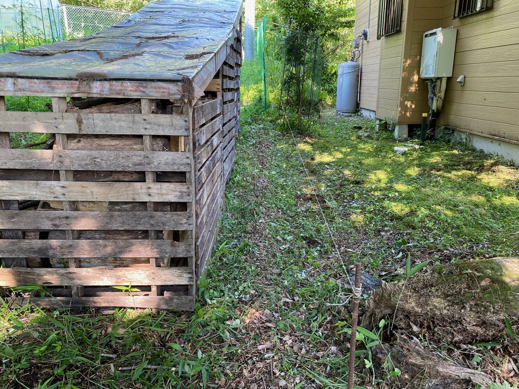 午後になると、木陰で作業できるので、薪棚の裏(境界線)