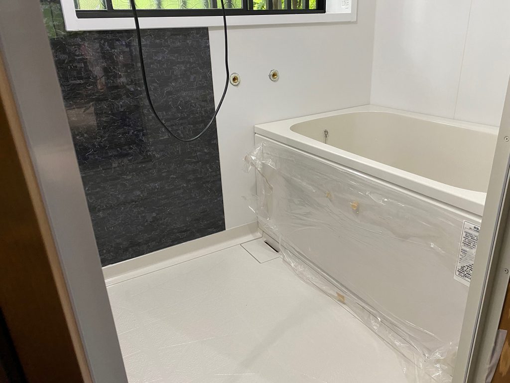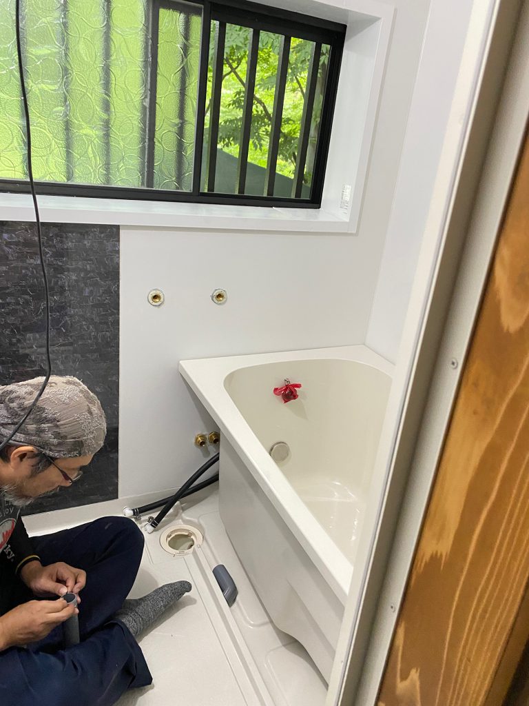 バスタブも固定し終え、給湯配管と、蛇口も設置(o^^o)