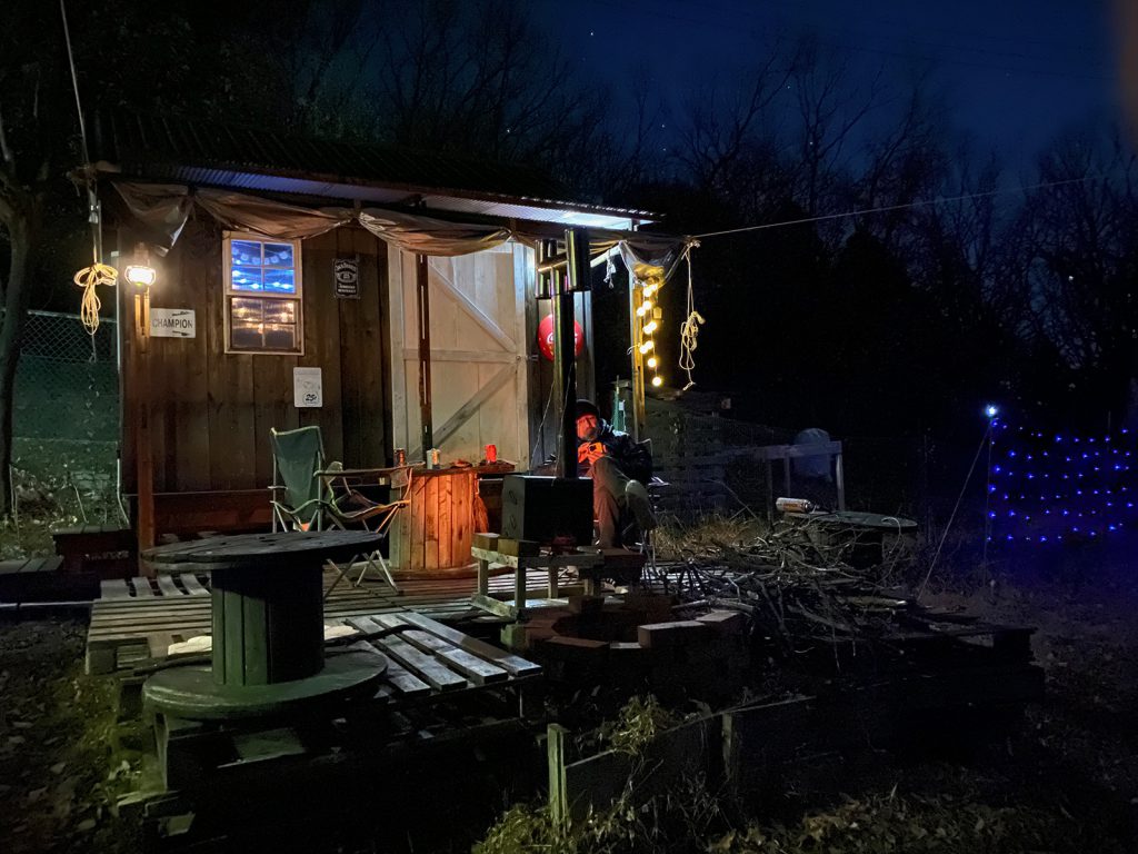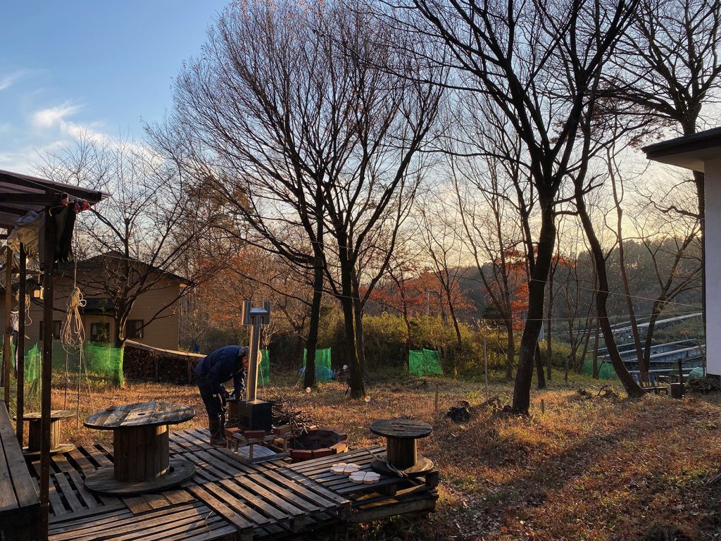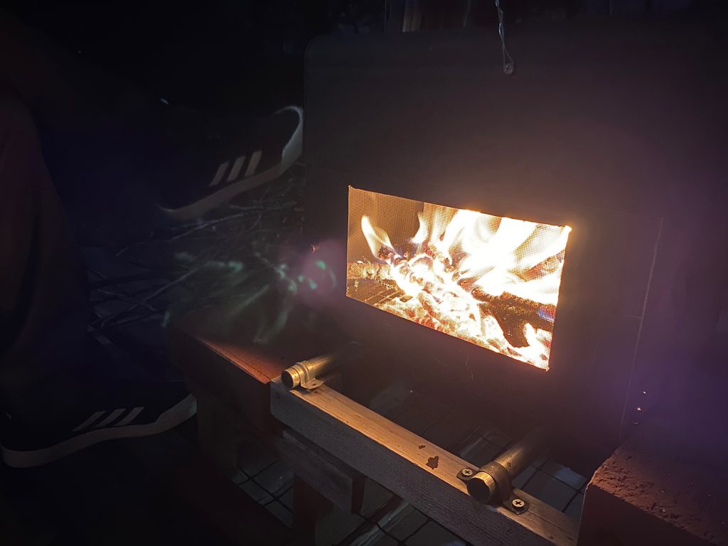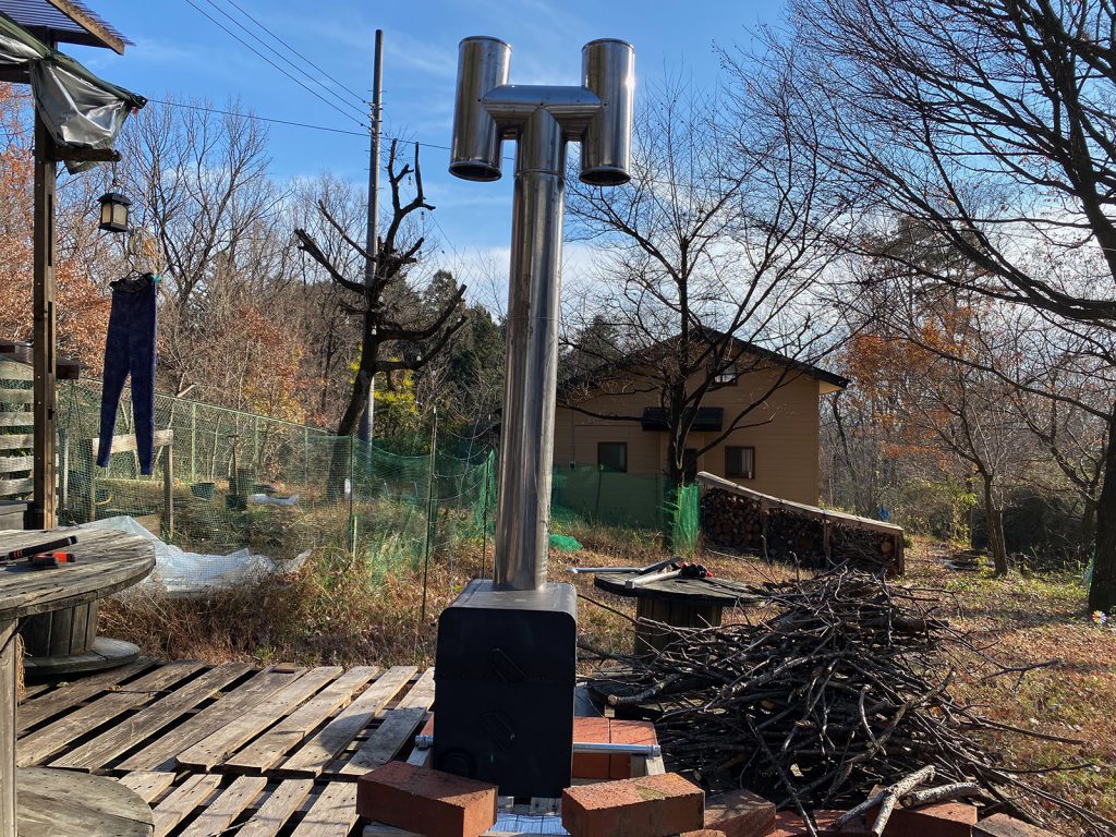 今年、新たに作り直した薪ストーブ、煙突を取り付けて__、