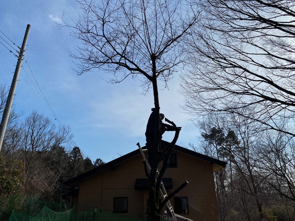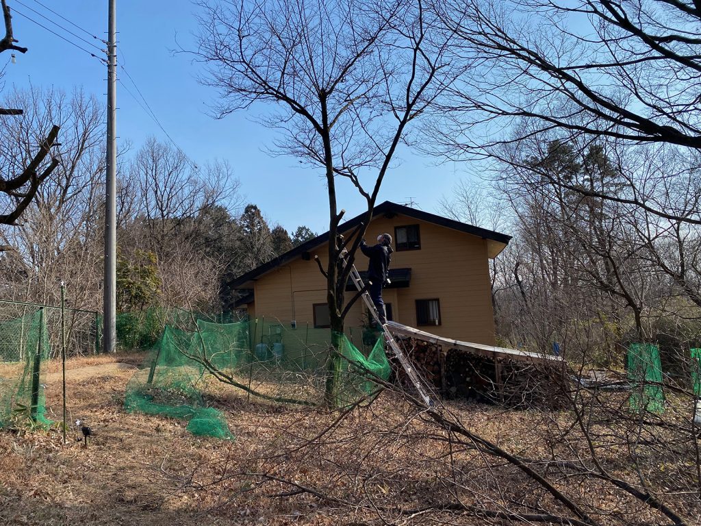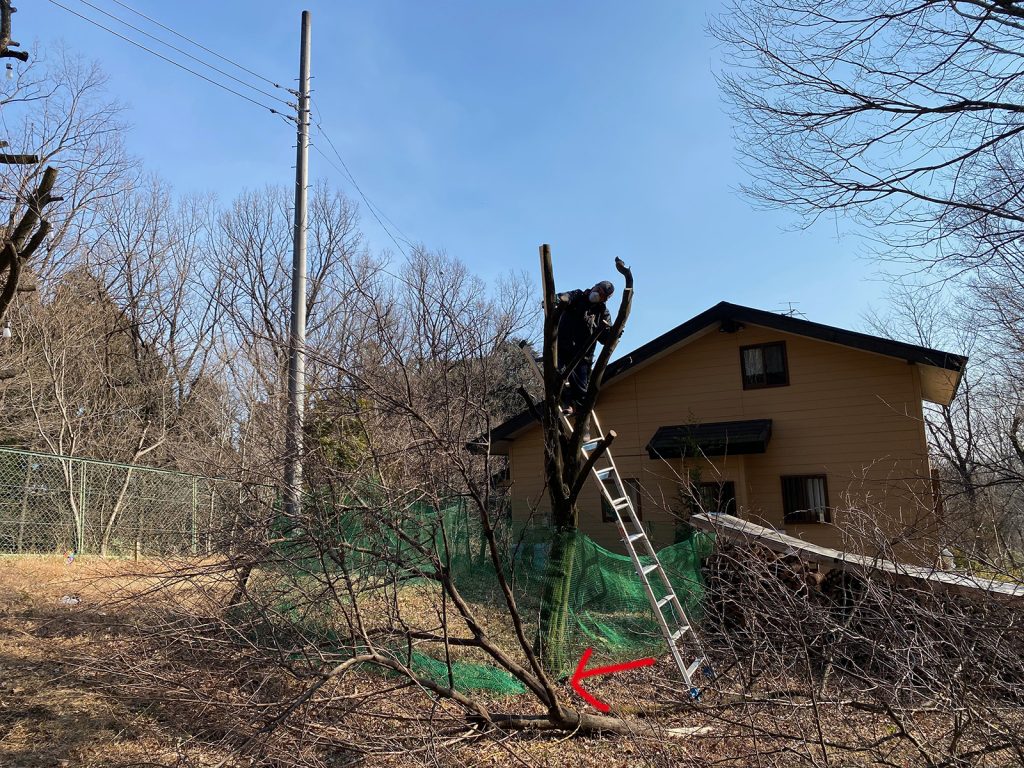 下手に倒れても困るので、手前でロープで引っ張り、無事剪定終了//。