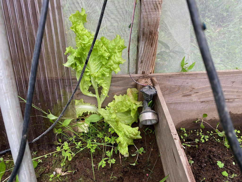 ビニールハウスの中をクリアにしたら__、なんと奥でサニーレタスが