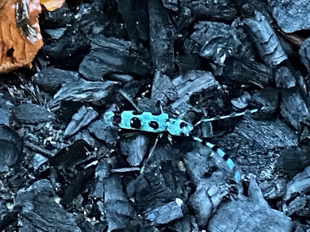 ご飯中に焚き火のところへ来客が,,,『ルリボシカミキリ』<初めてみた…>