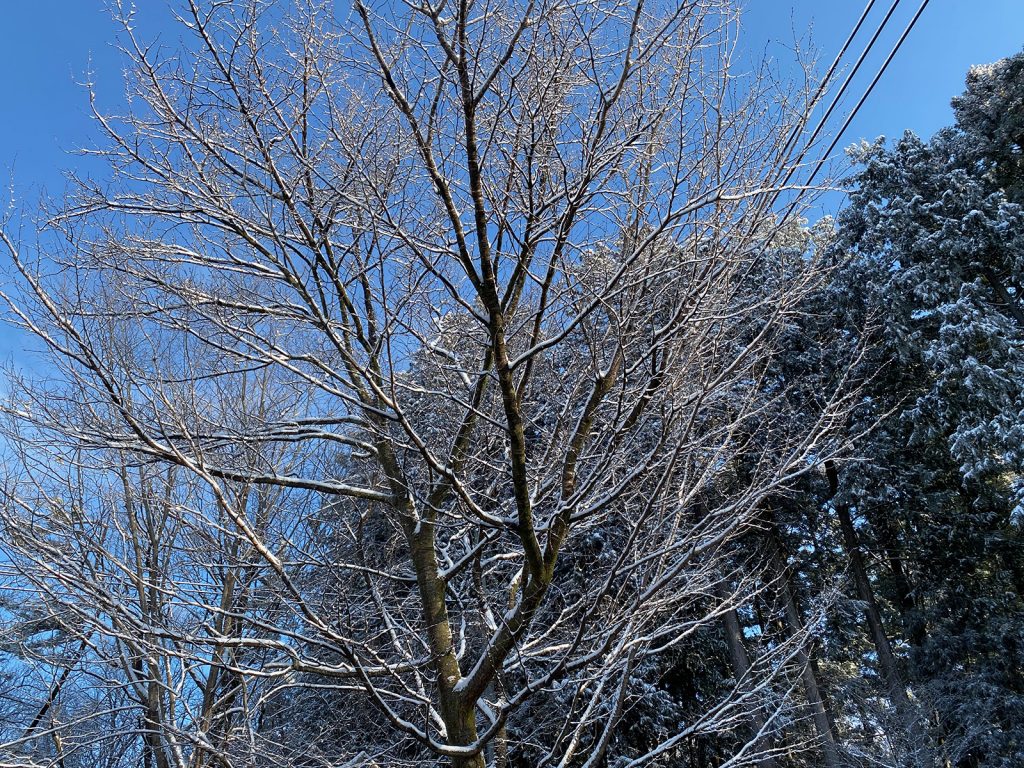 雪の重さで、伸び切った枝を切りながらの散策、、