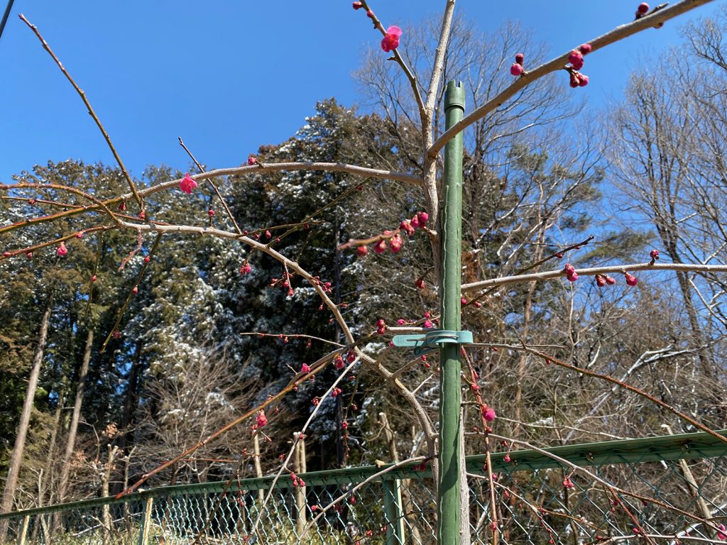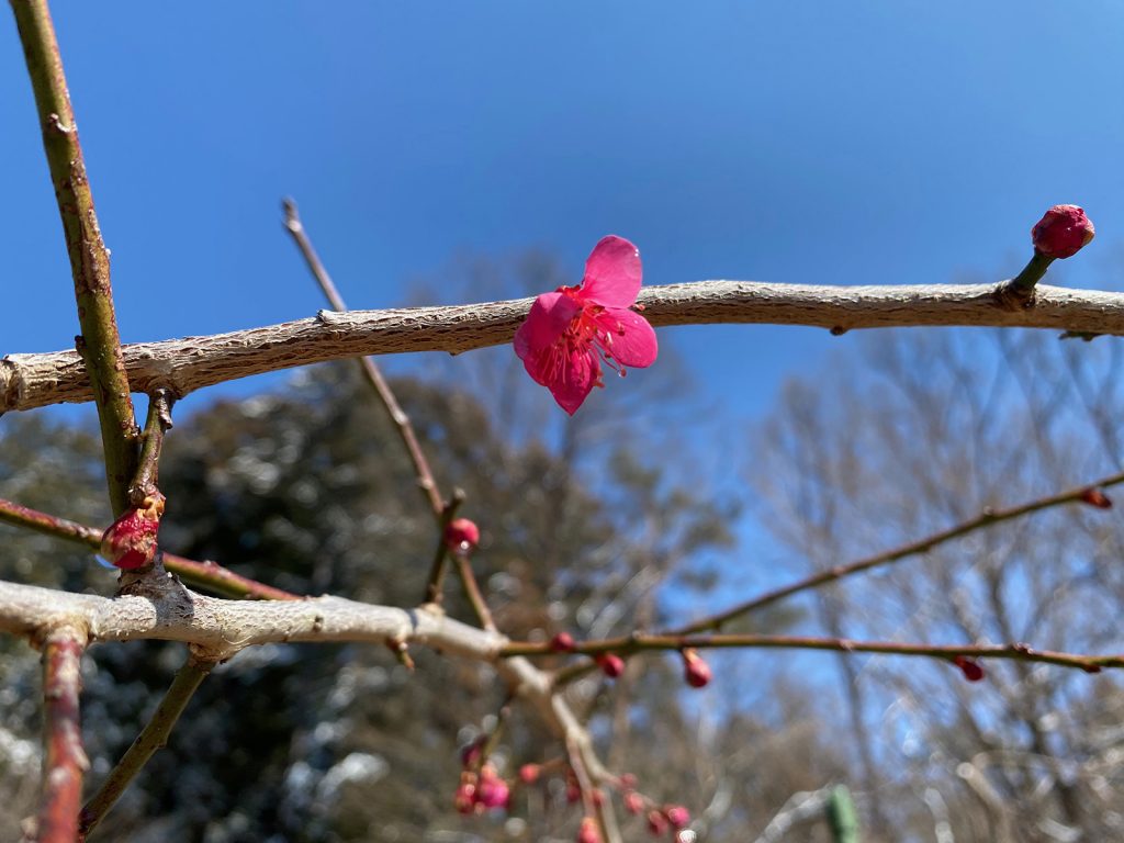 雪が降ってても、コツコツ、開花してた枝垂れ梅