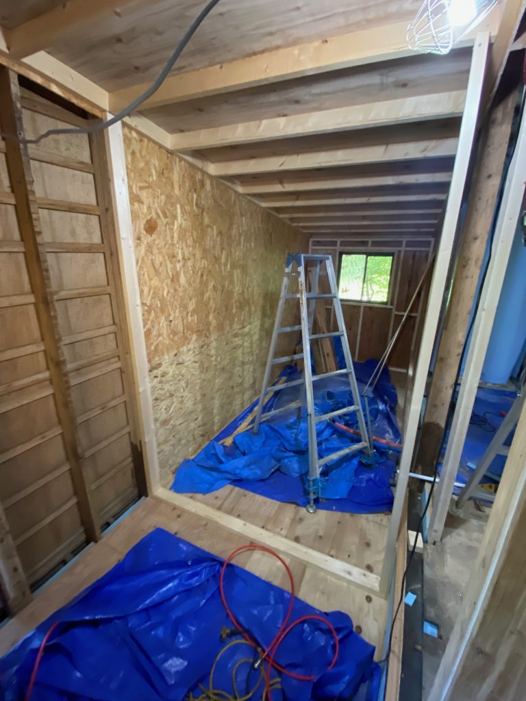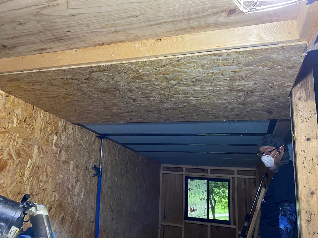 天井のスタイロは貼り終えて、いざ、天板を、、( ̄- ̄;;;;)