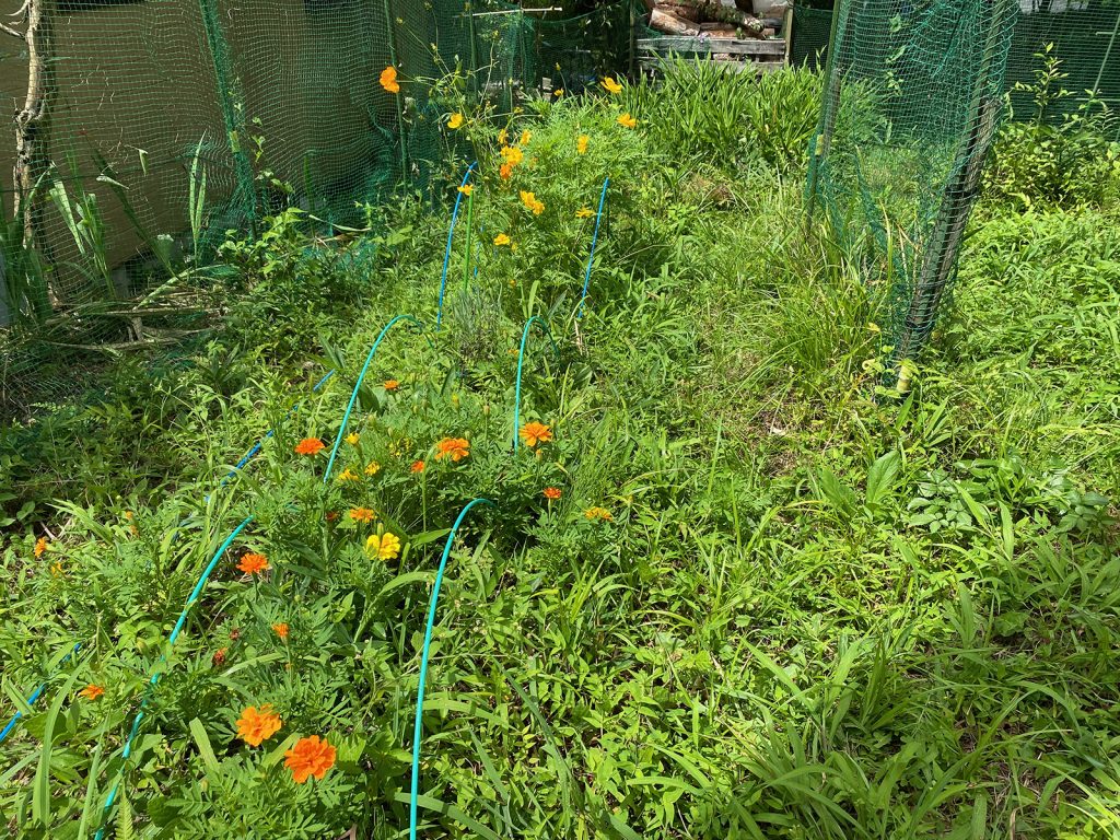 連日のゲリラ豪雨で、雑草もわさってるけど、今年は、マリーゴールド(手前)と黄花コスモス(奥)が