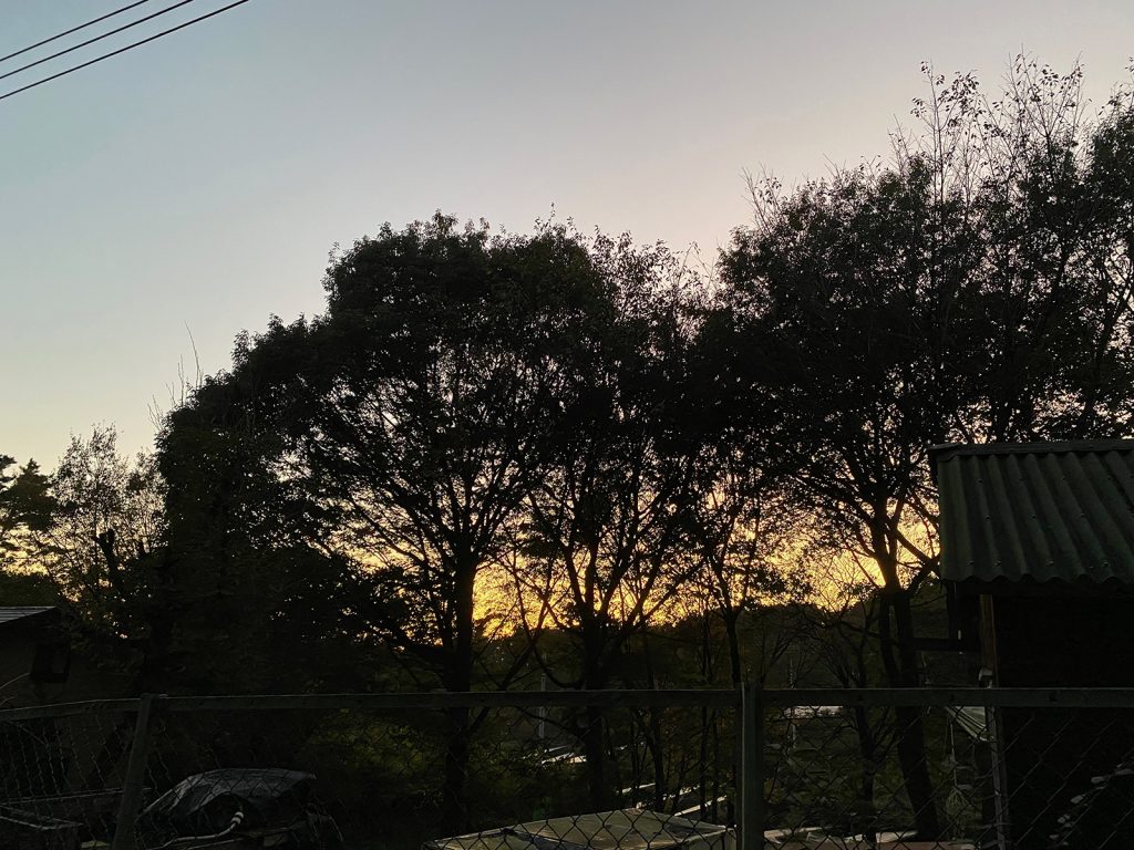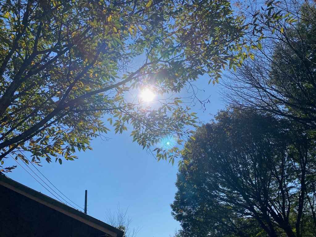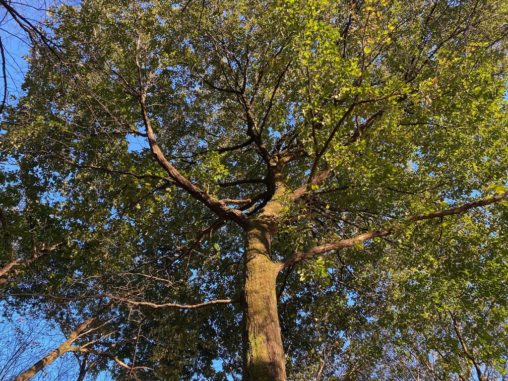 西陽に照らされて、このどんぐりの木、デカいなぁって、今更、下から眺めてみた、、