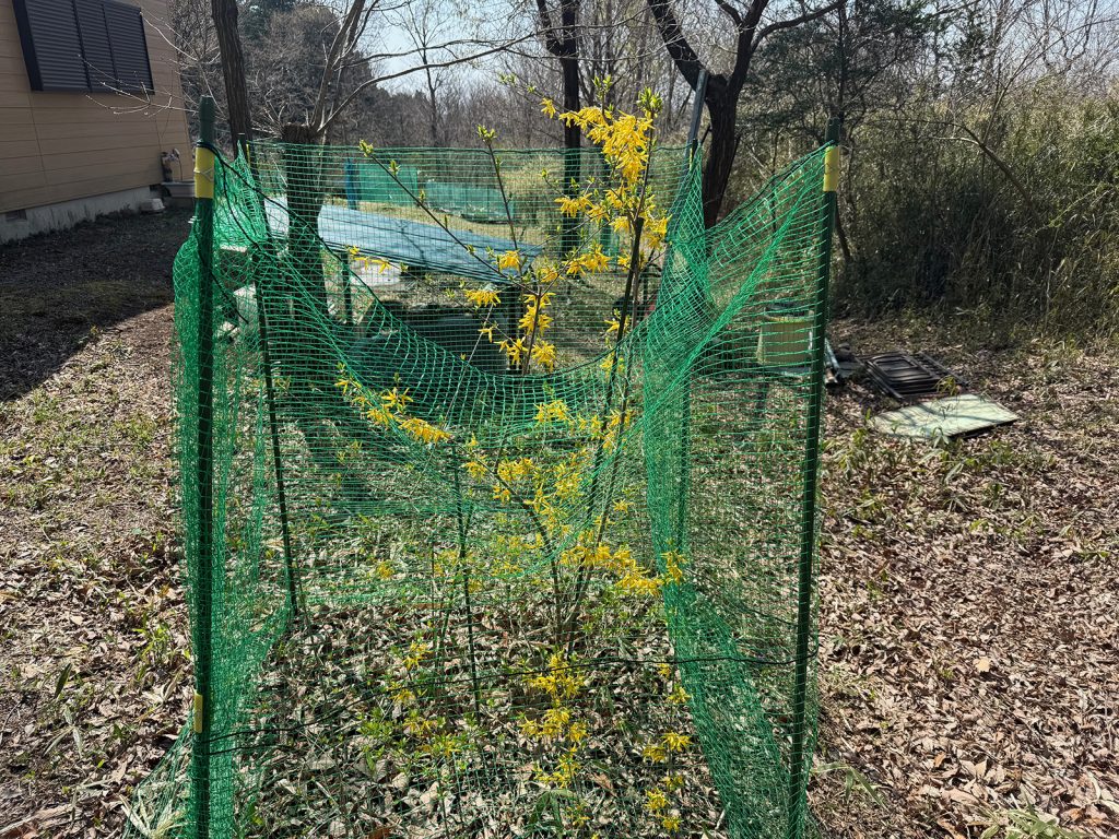 レンギョウ、先端の花々は、鹿にやられたか(|ω-)ネットの下りが怪しい…
