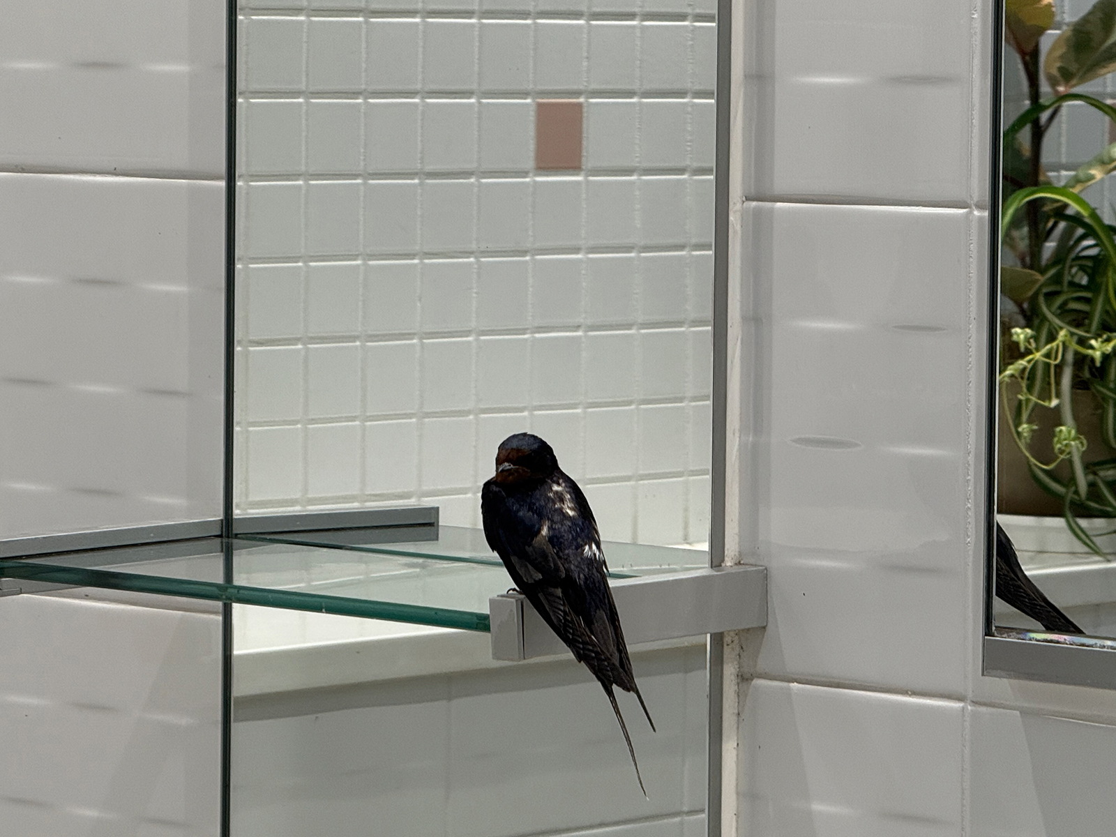 トイレにツバメくんが(∩_∩) こっち見てるけど、顔が黒い(^^::)