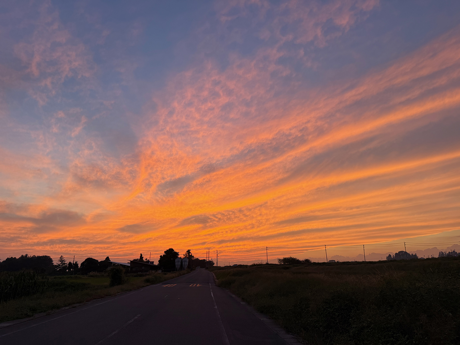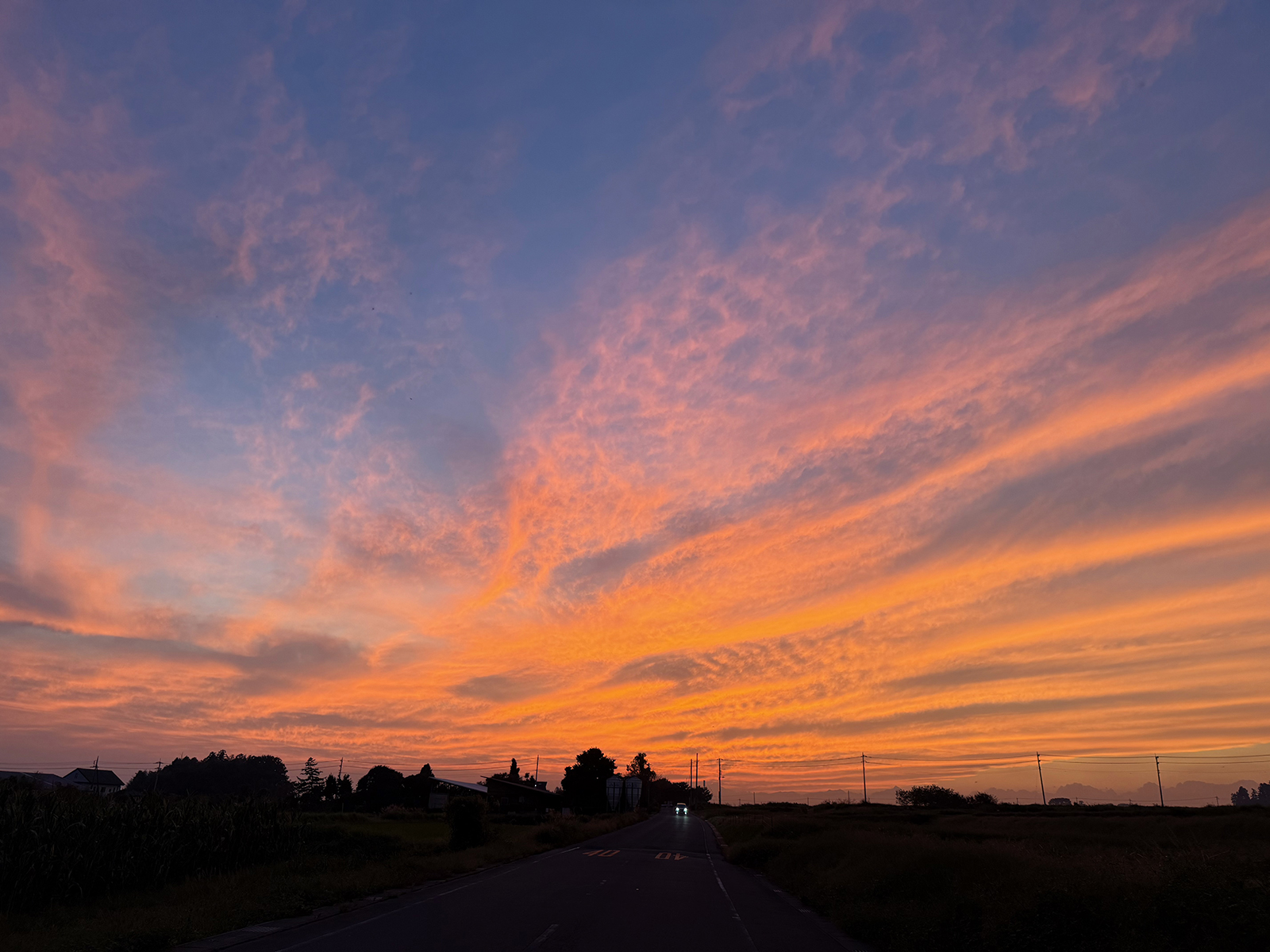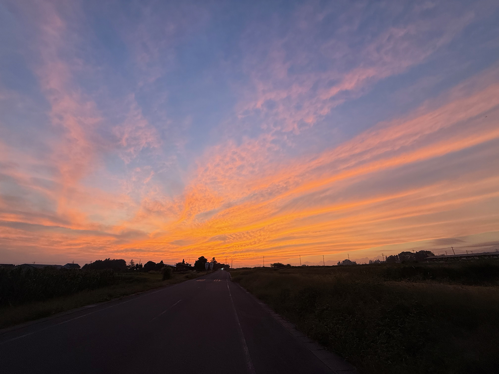 高速走行中、雲一色だったのに、突然、夕陽が出てきて、