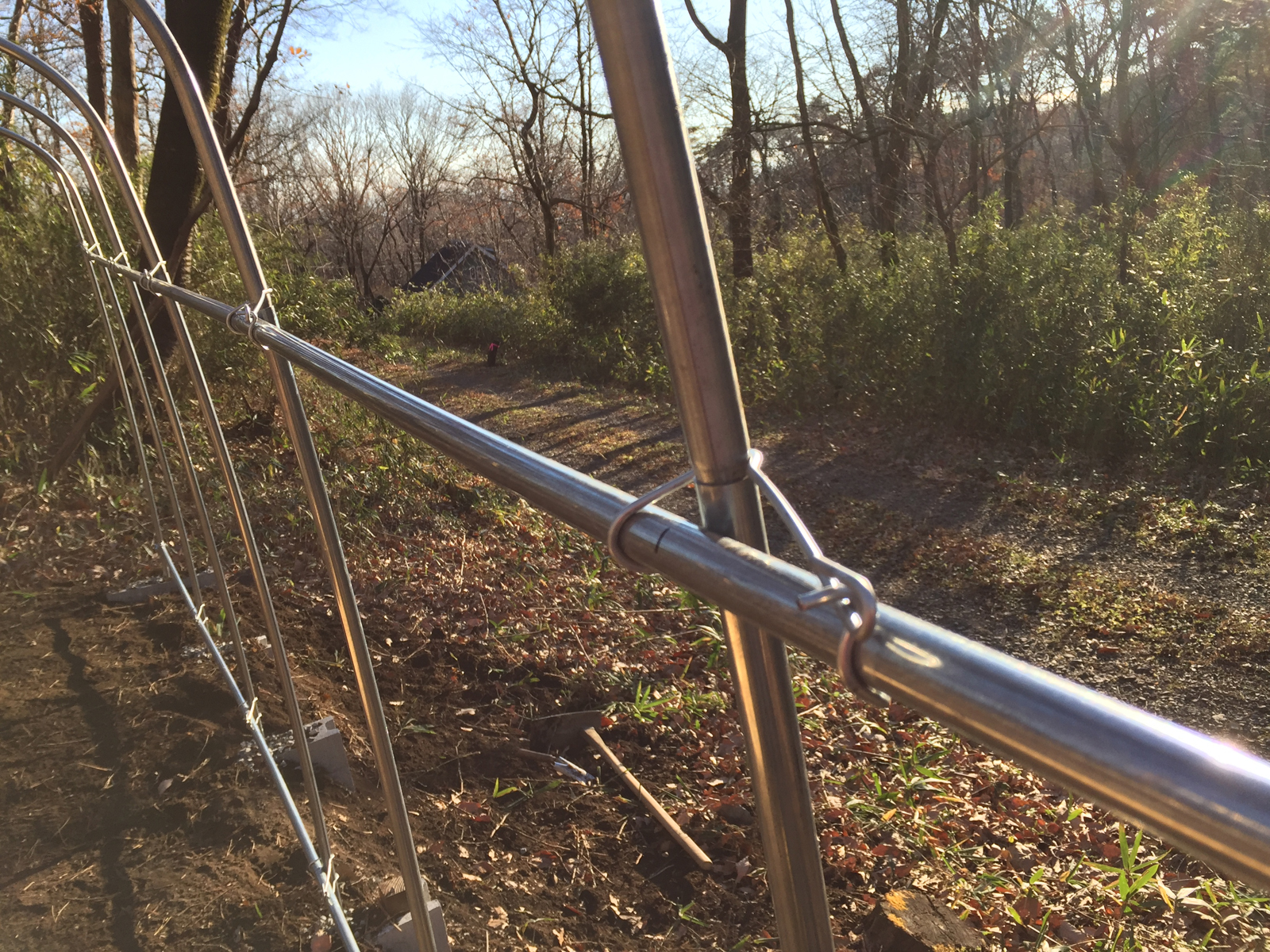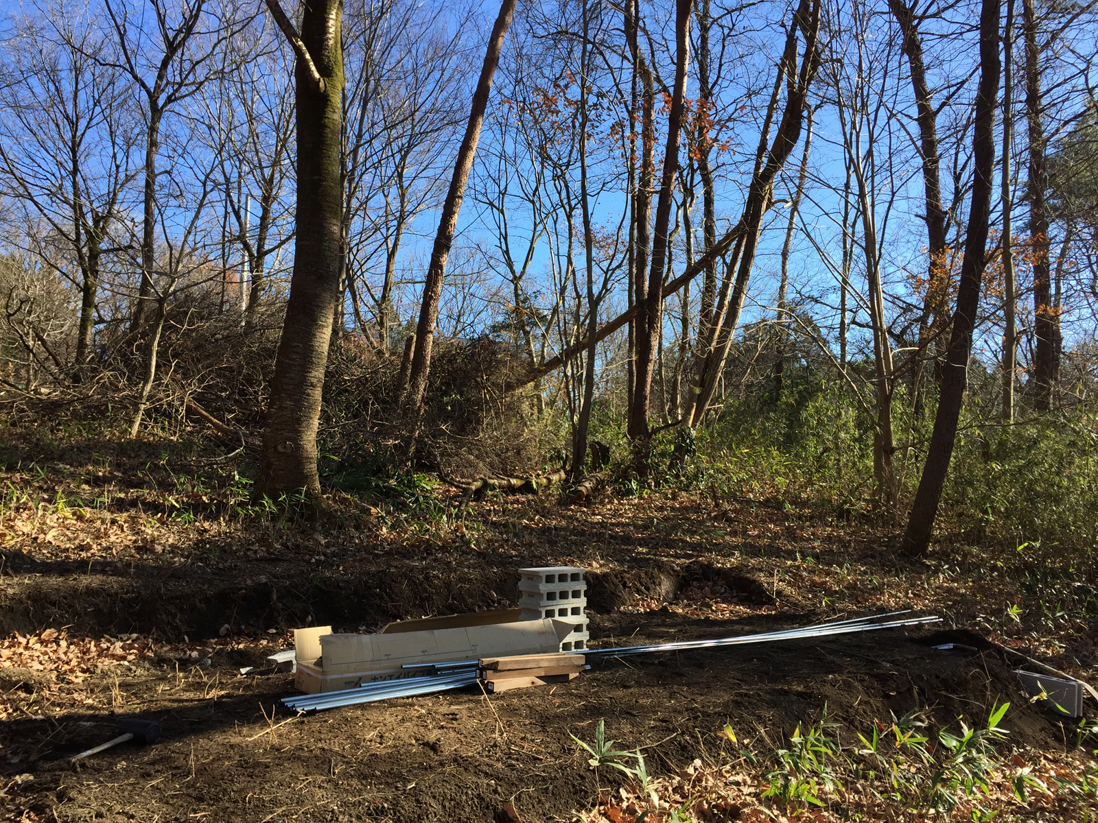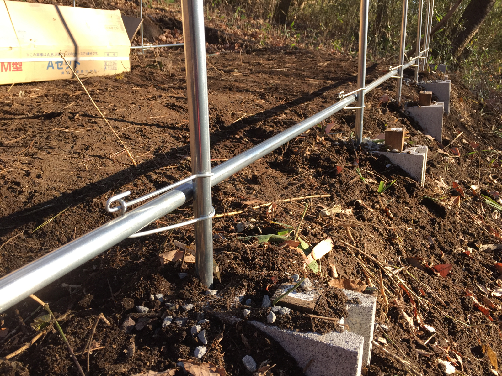 土が柔らかいこともあり、ポールをブロックで固定して、砂利と土でさらに固定
