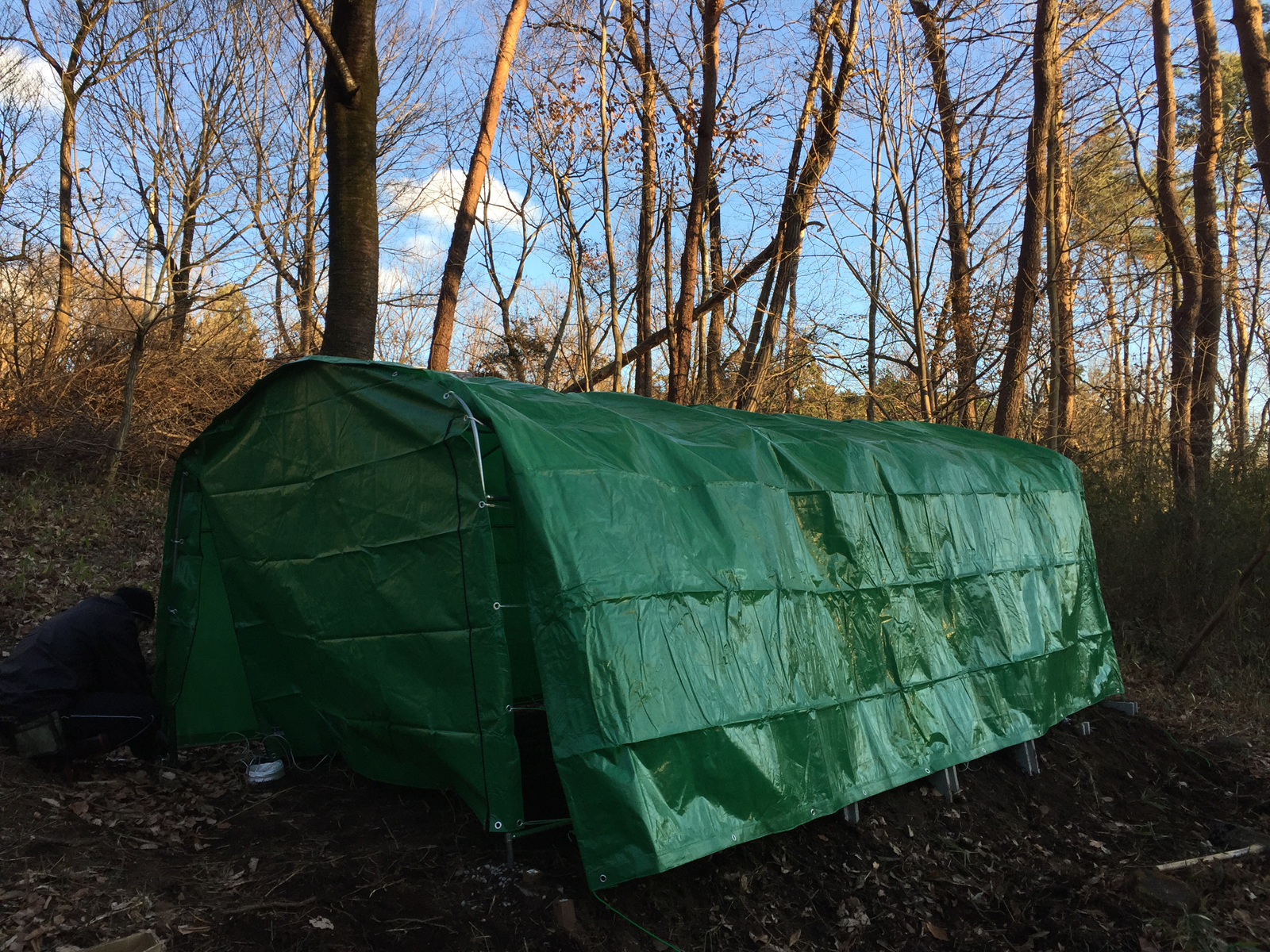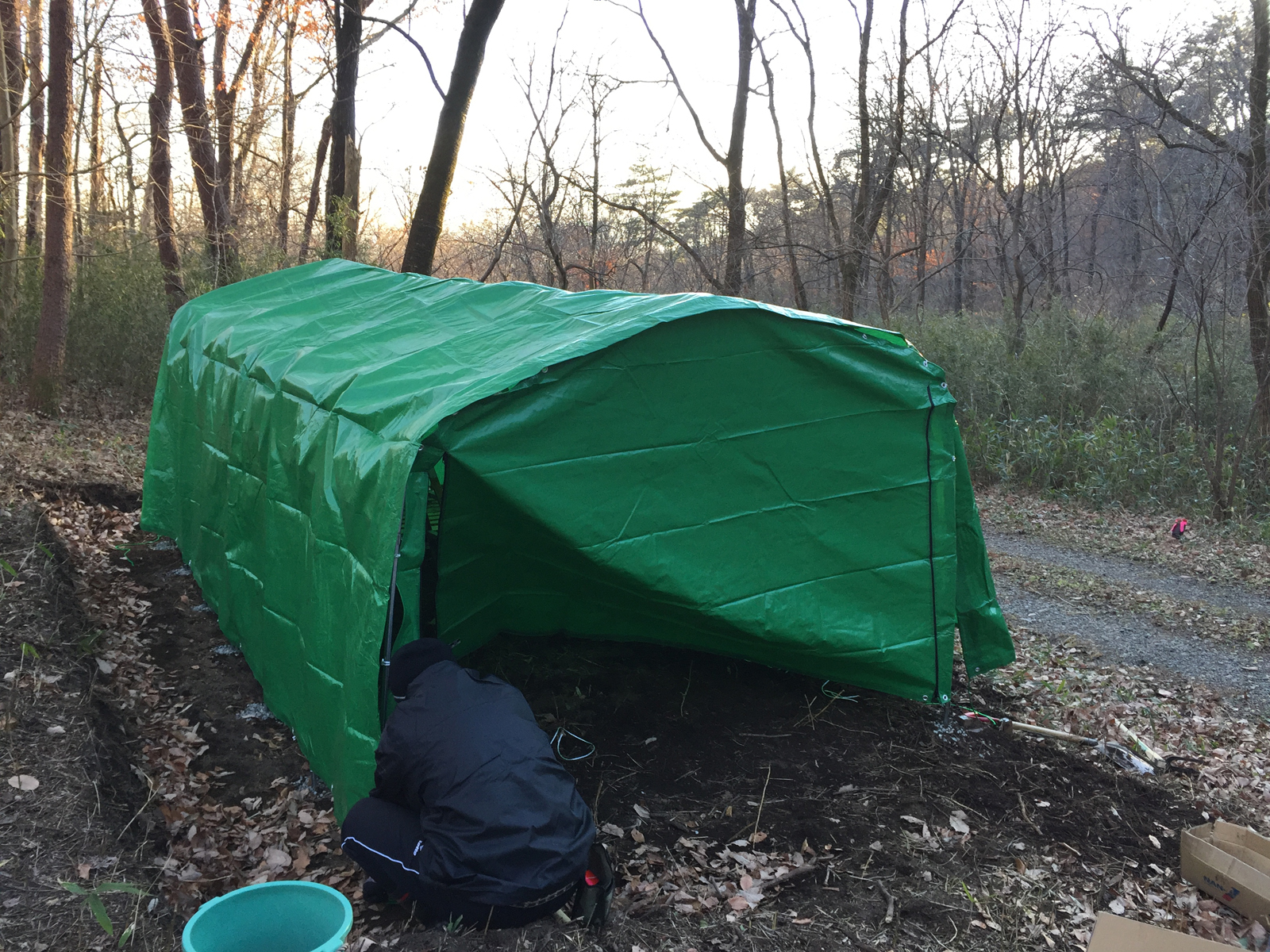 さすがに外でのテントは勇気なく、家屋内で設営。