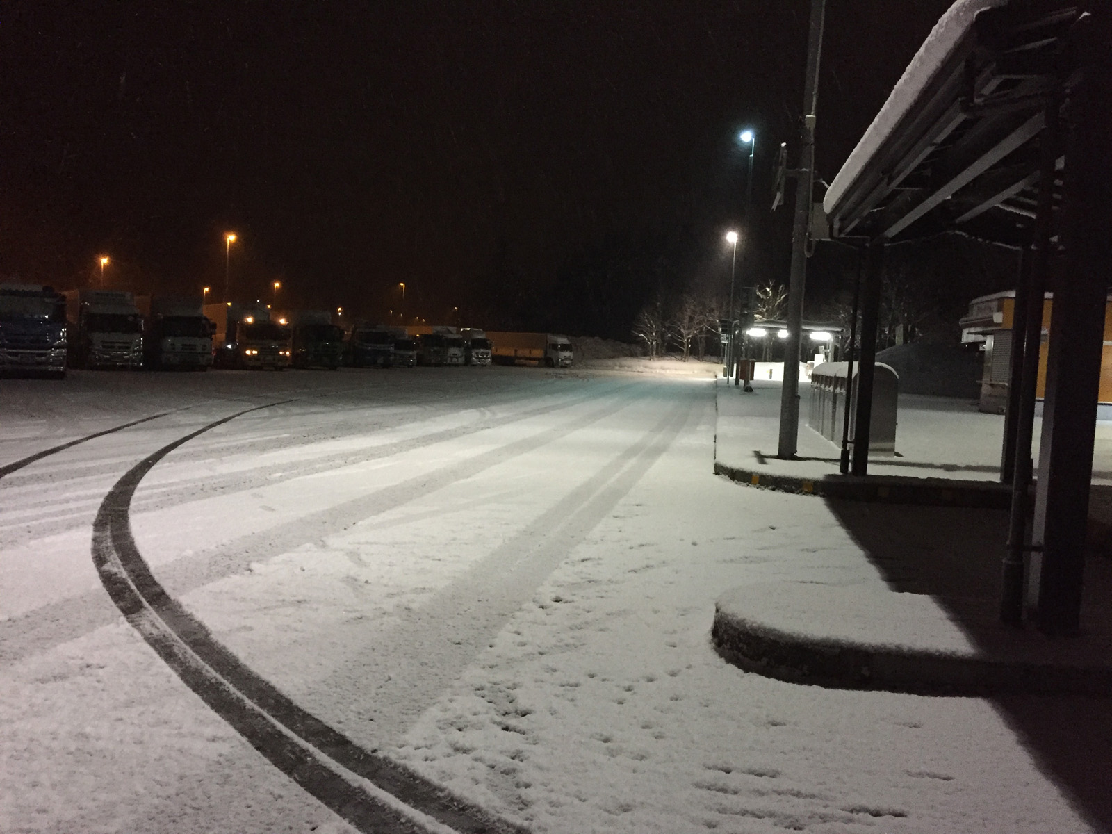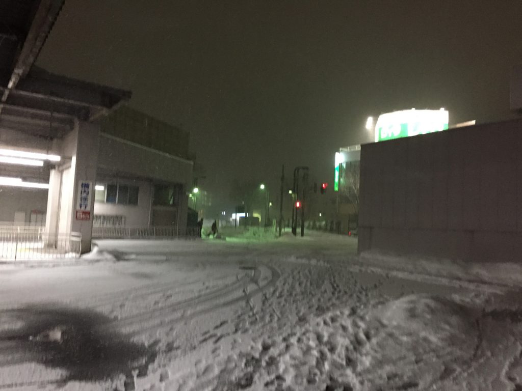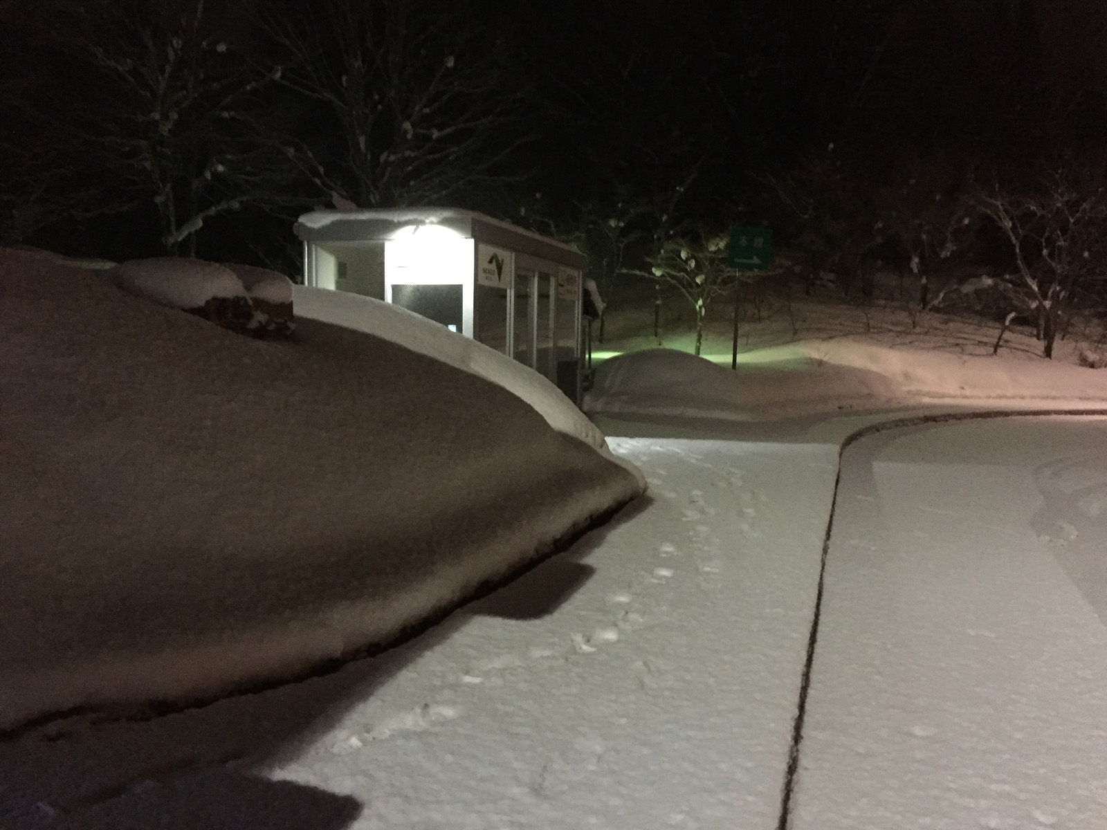 PM10:00発のノクターンへ。(バスターミナル前もまだ雪が降り続いてた)