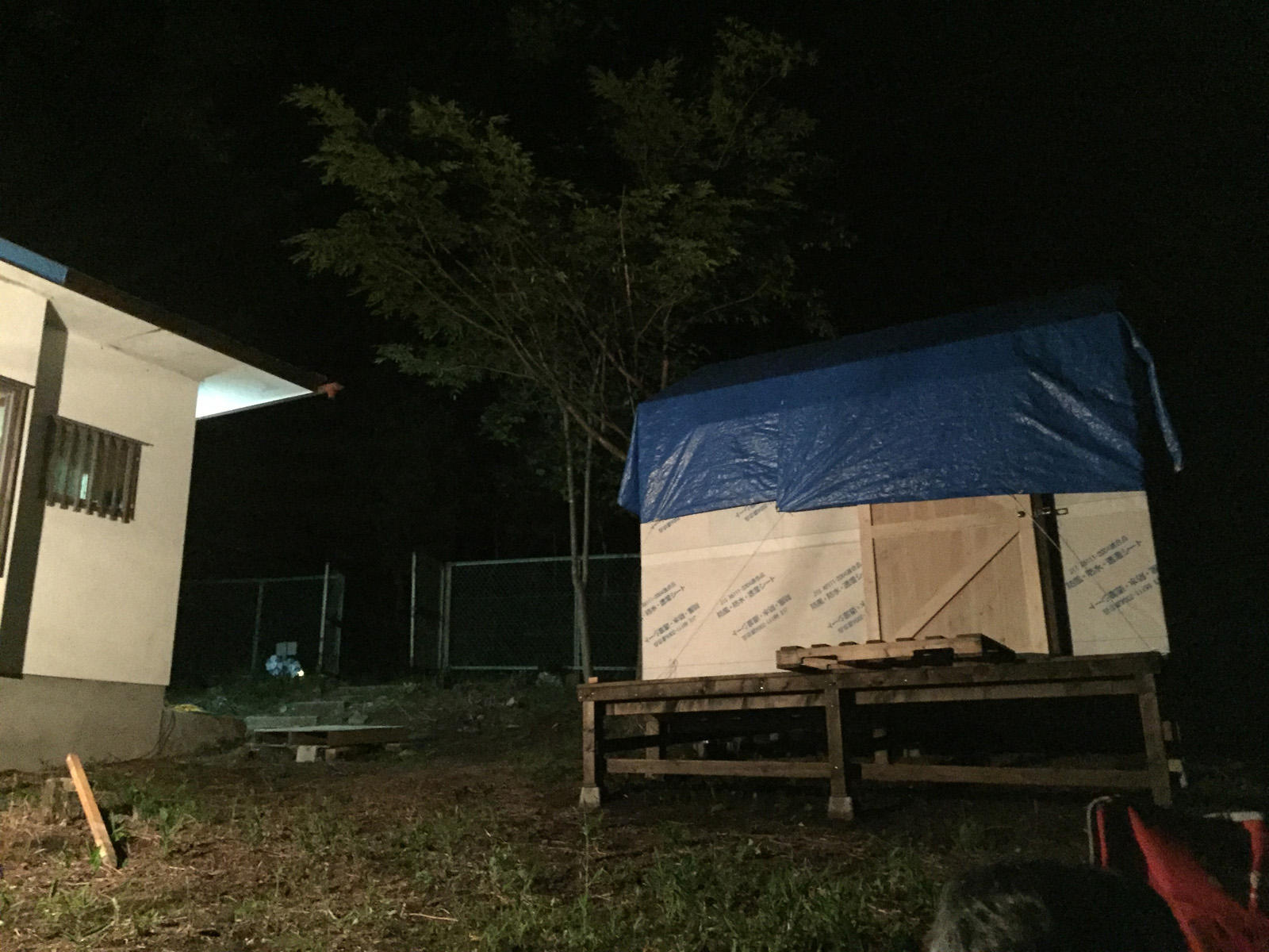 現地に戻り、屋根の雨対策で、シートを再度、被い