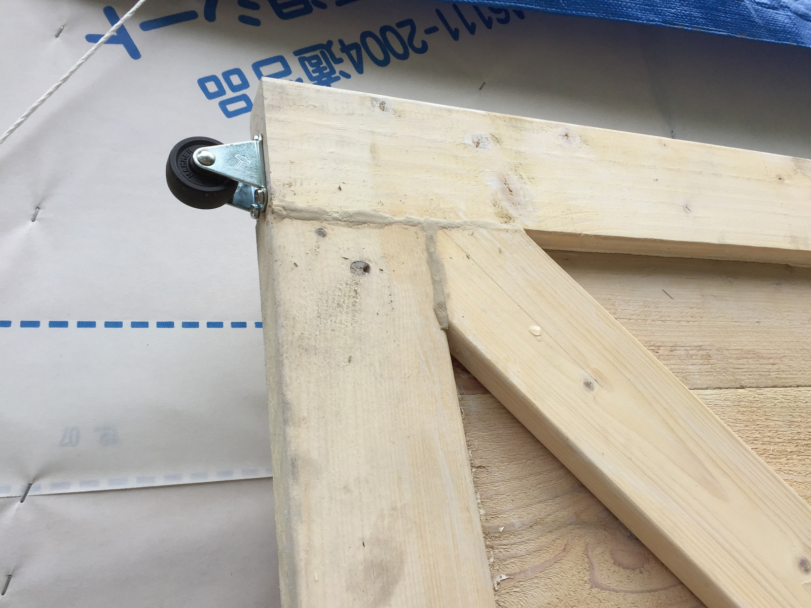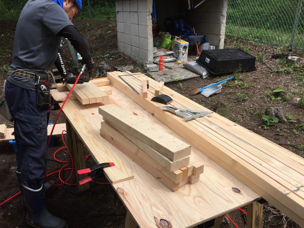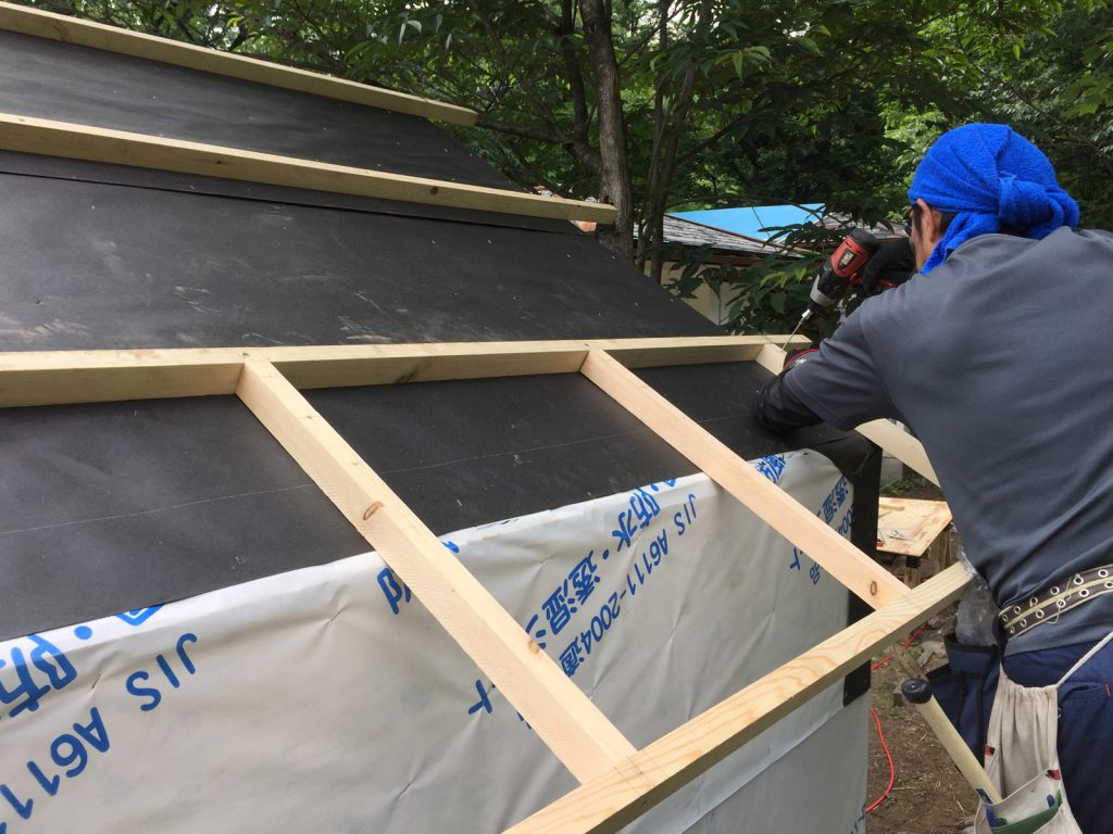 で___いざ、屋根作業だ。さっきカットした角材を//