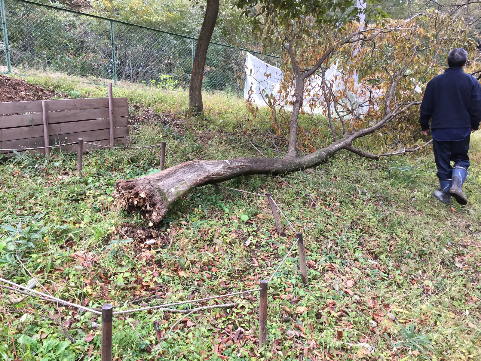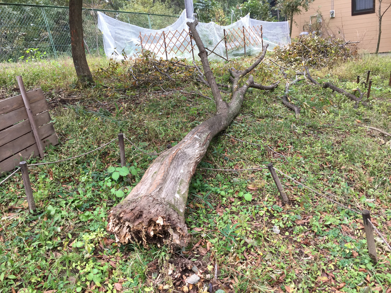倒木の先は、畑の柵も折れ曲がり、、