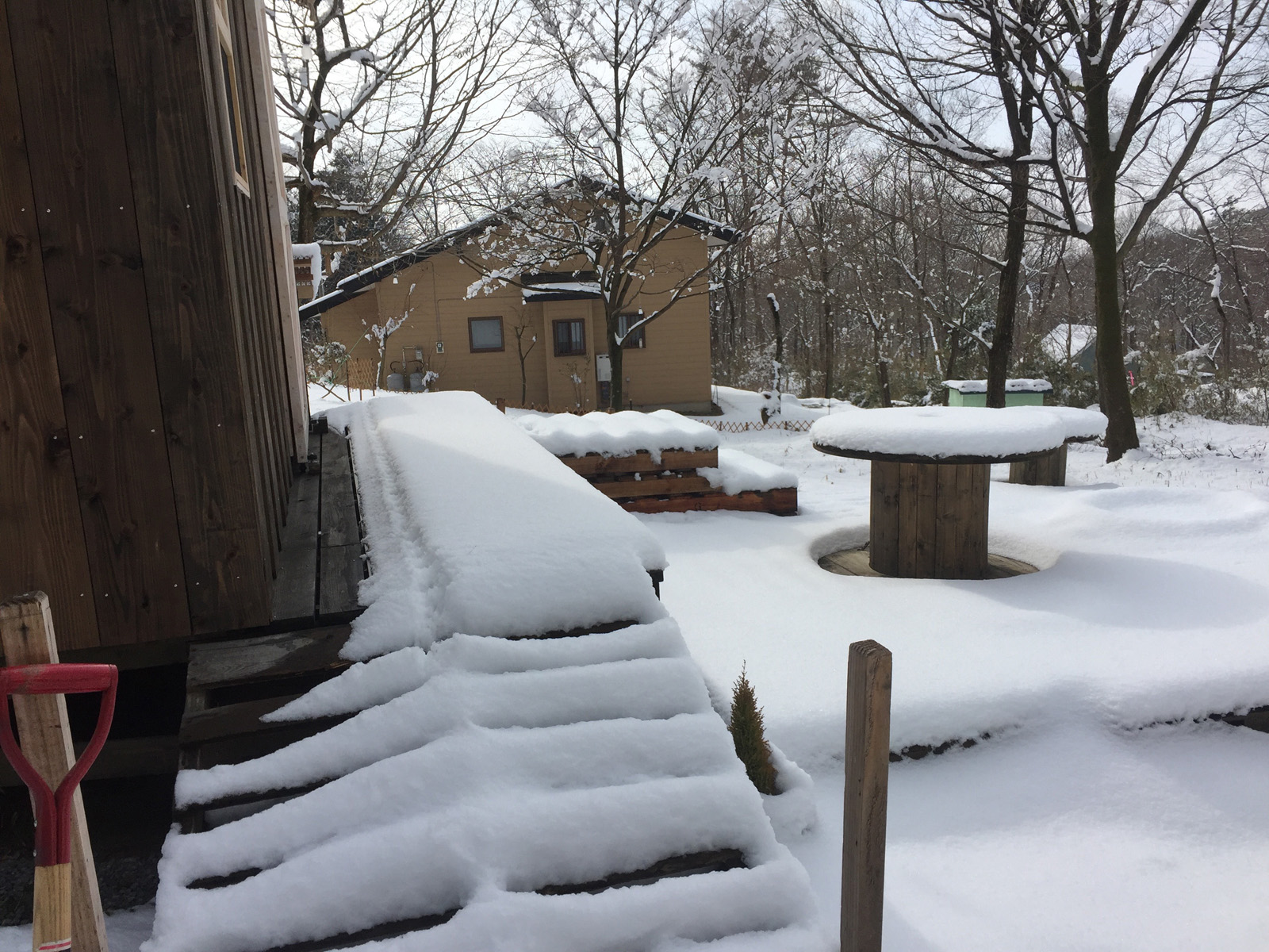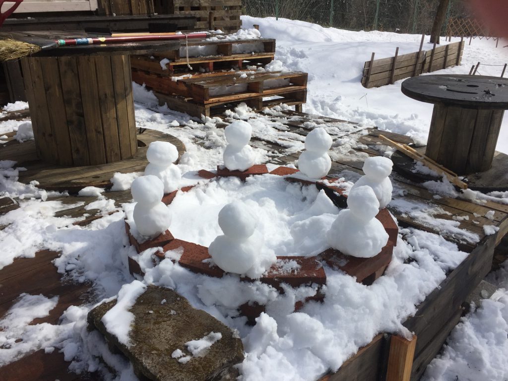 焚き火スペースに、、7人の子きだるまも<ふーっ、汗だくだぁ>