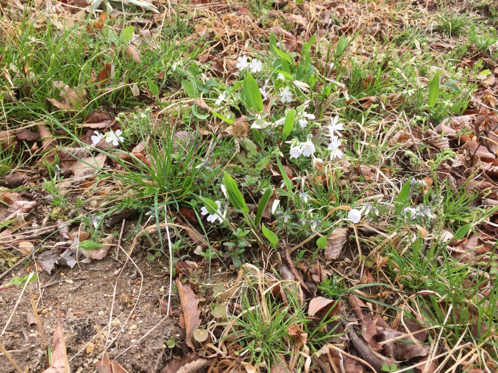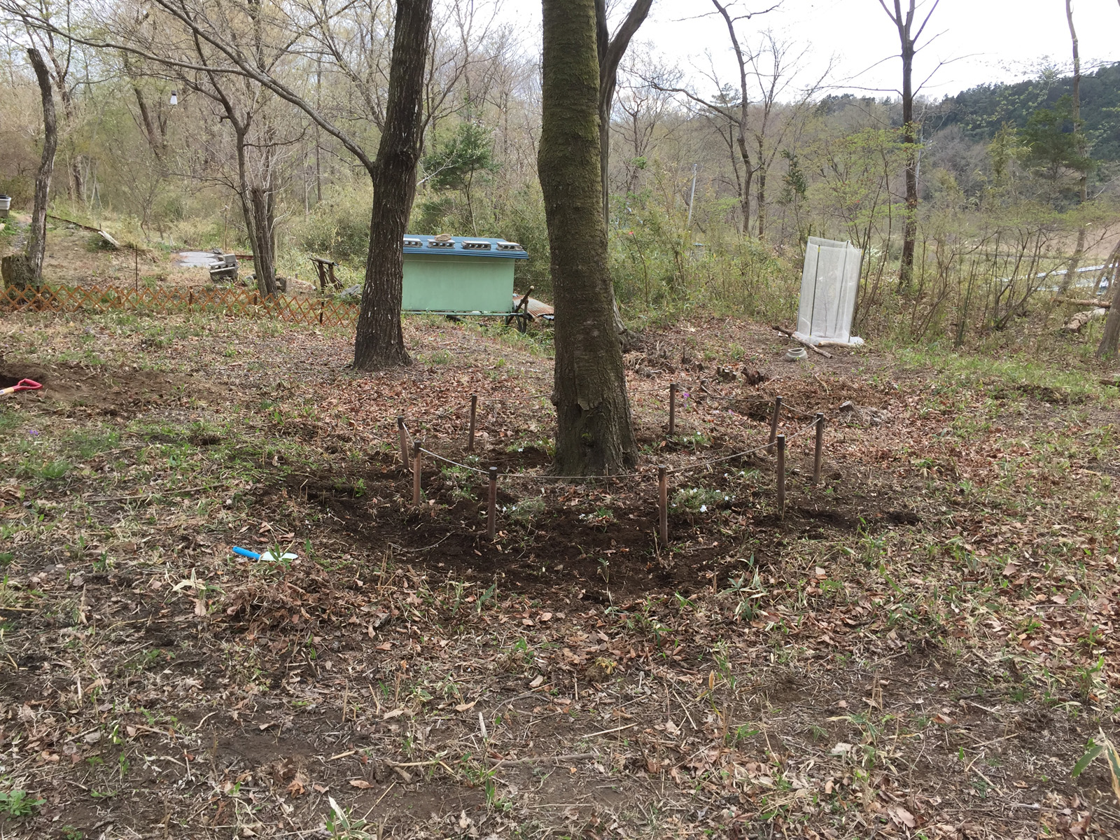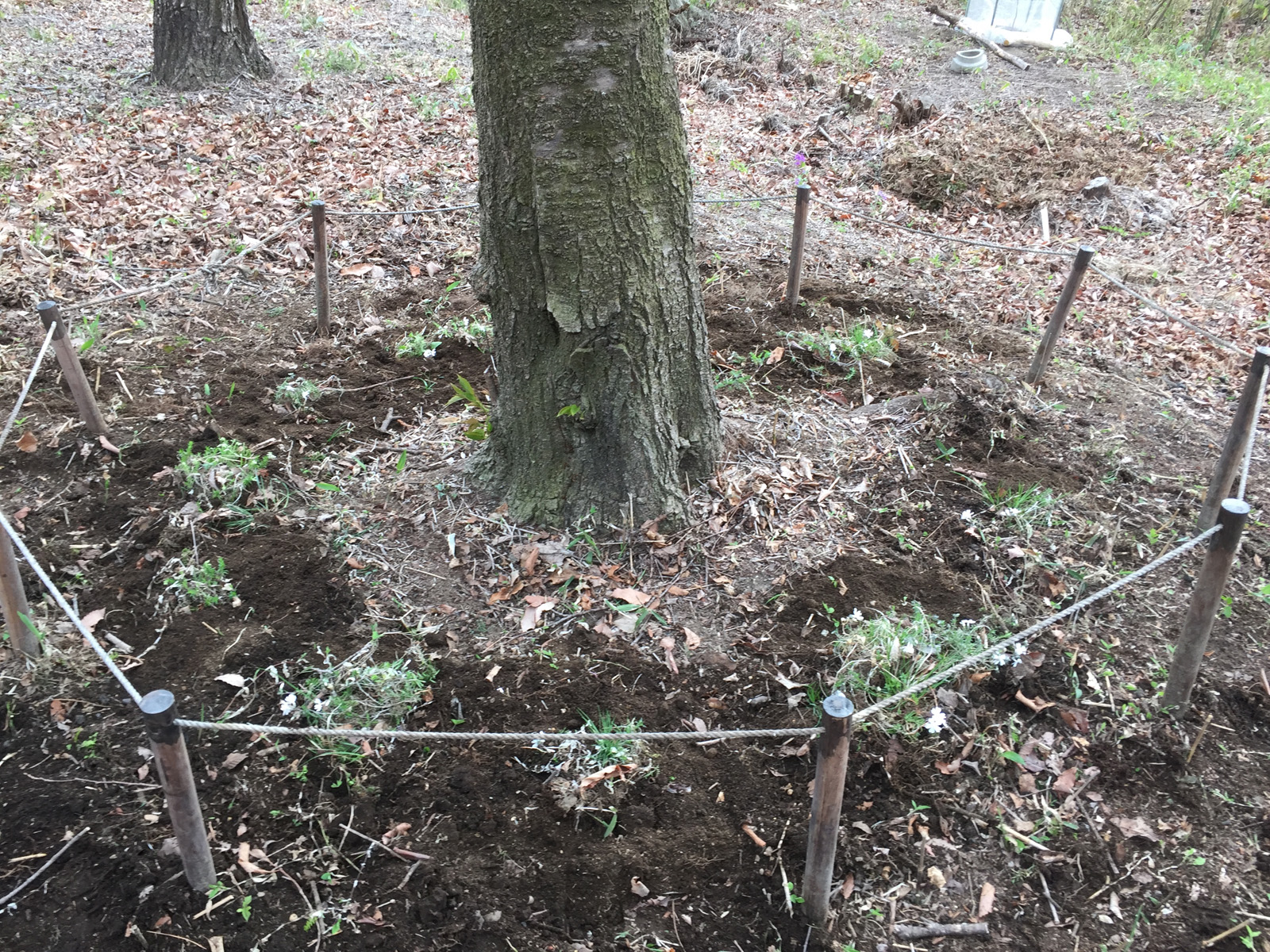 去年植え付けた芝桜(手前の木のサークル)、雑草あるけど、咲いてくれたぁ〜☆⌒c⌒/