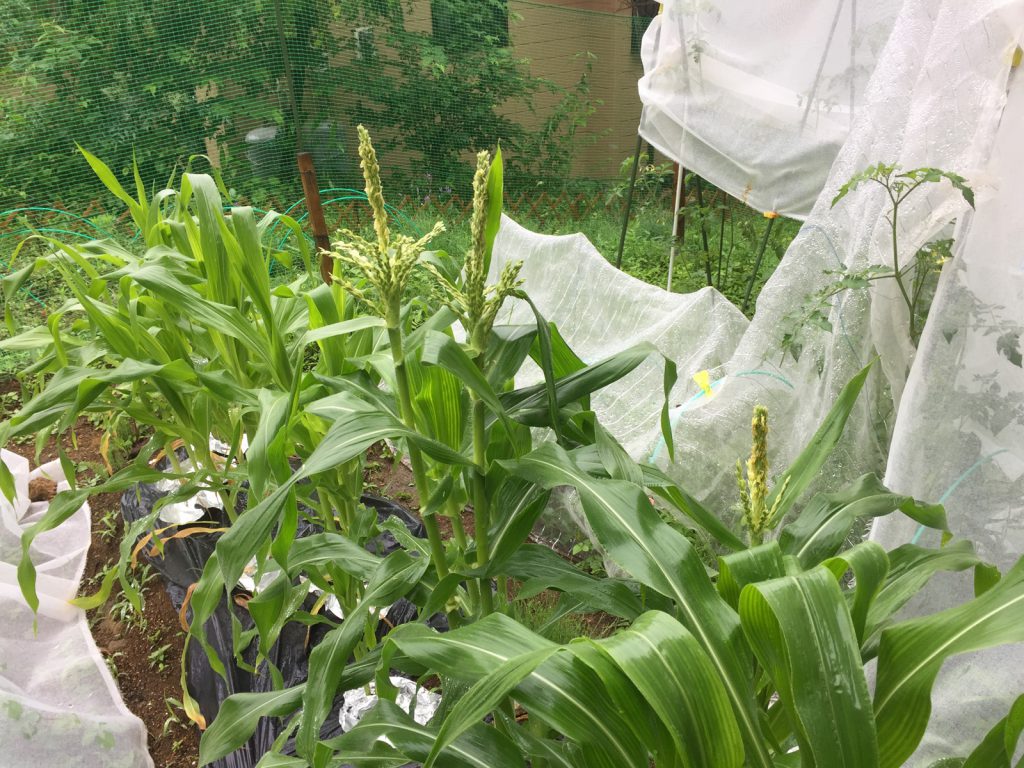 こんなにジメッてて、野菜の成長もイマイチの中、手前のとうもろこし(サニーショコラ)の頭が