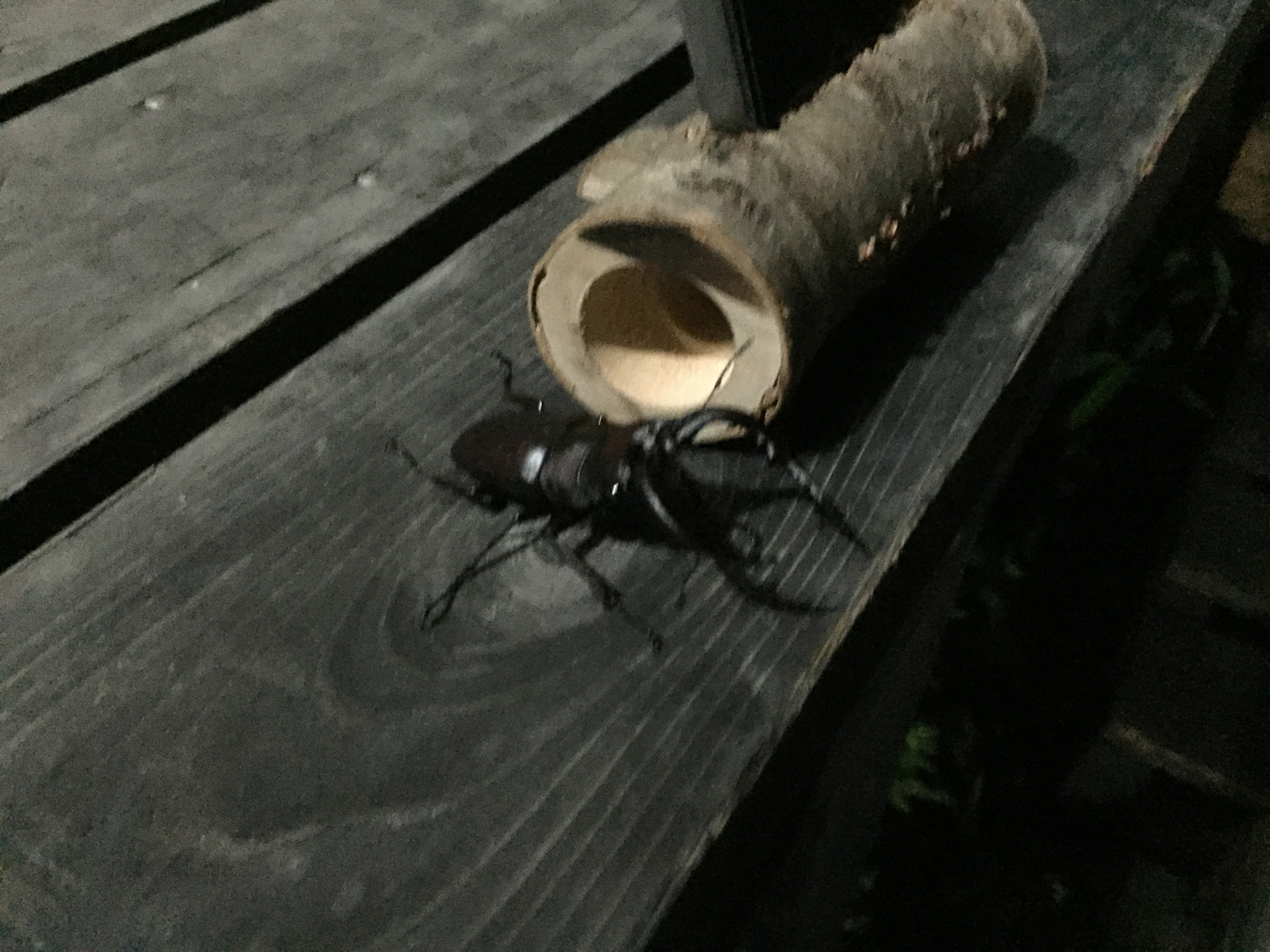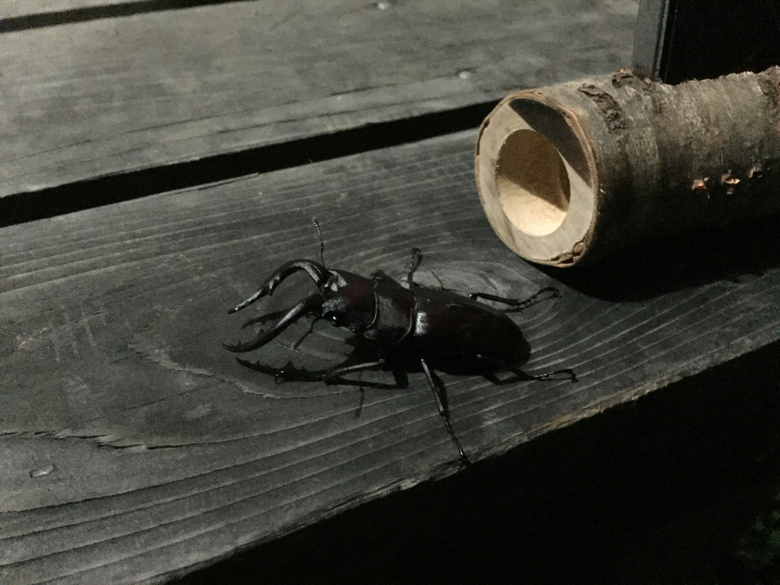 夕食後、雷もやっと静かになった頃、何気に小屋のドアに__ノコギリクワガタ君、来訪//