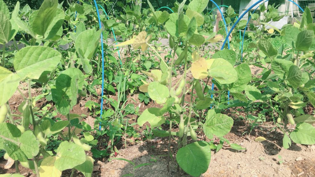 試しで、種から植えた枝豆は、、成長良くても、日焼けし過ぎか黄色く、、抜いたらしい。