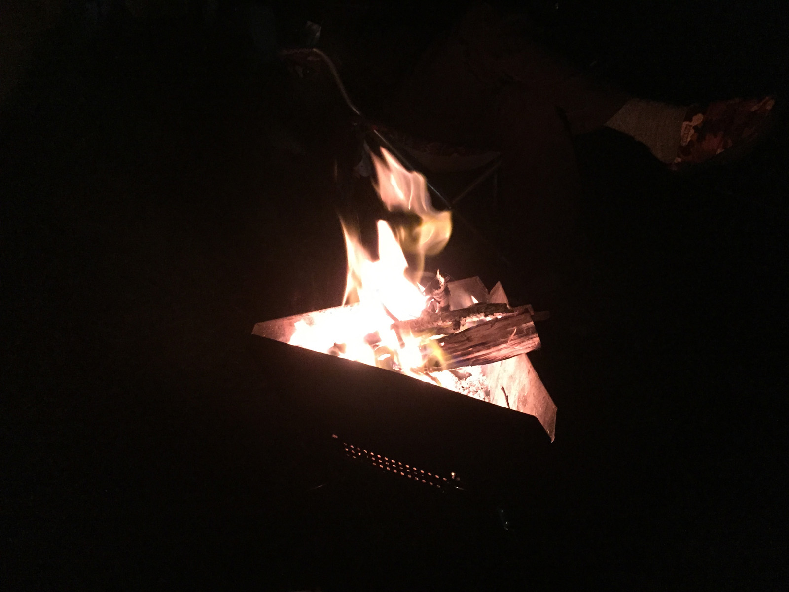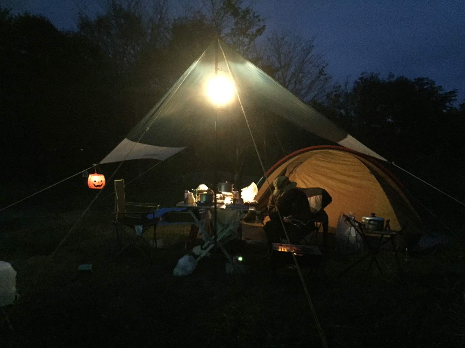 どんよりした夜空、今回、星は出そうにないなぁ・・。さぁ、焚き火しよっ〜と。