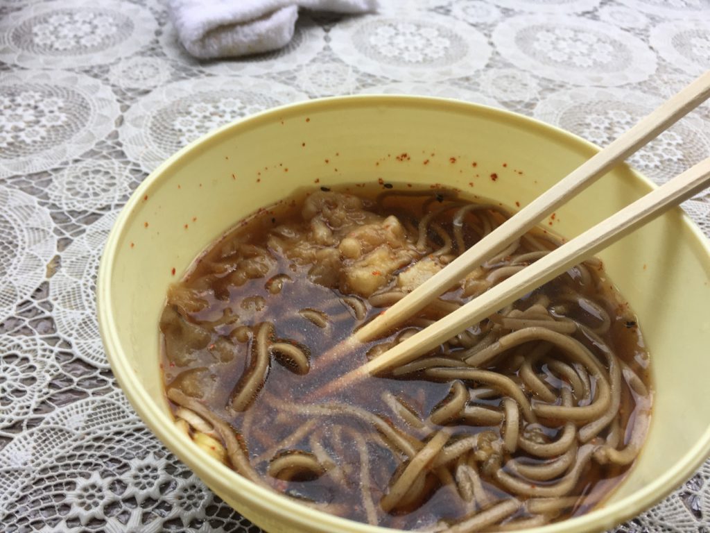 帰りは、丸美屋自販機で、今回天ぷらそばを。。