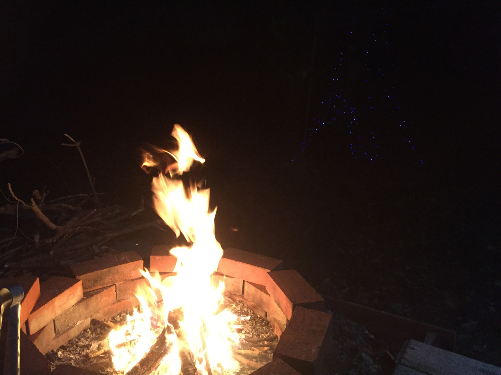 奥にイルミネーションも点灯しつつ、今夜も焚き火ッチャいましたぁ//