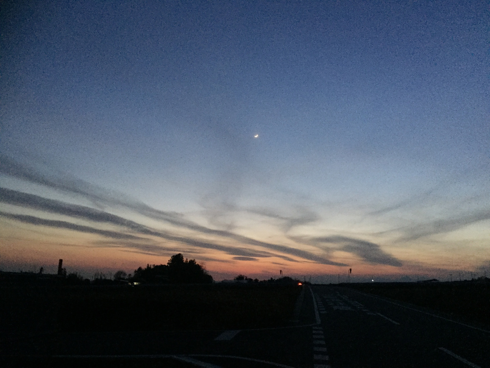 温泉へ向かう途中、、綺麗な三日月とともに、この夕焼け/。..