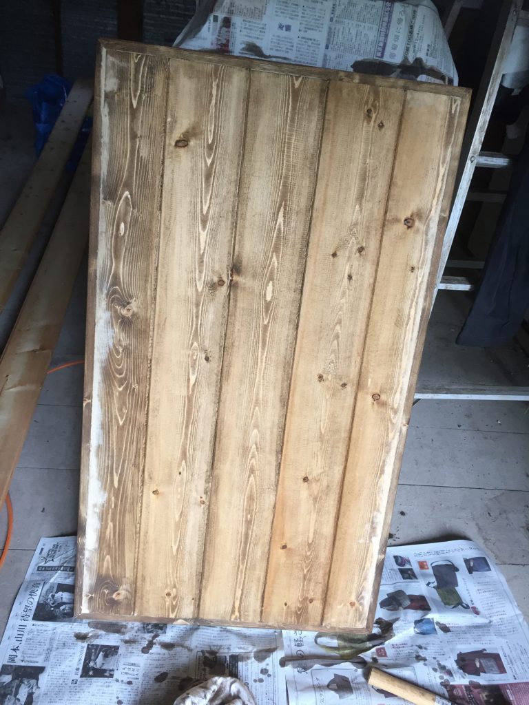 終わったところで、ニスを塗るも、端っこの白い部分がやはり気になるなぁ、、、