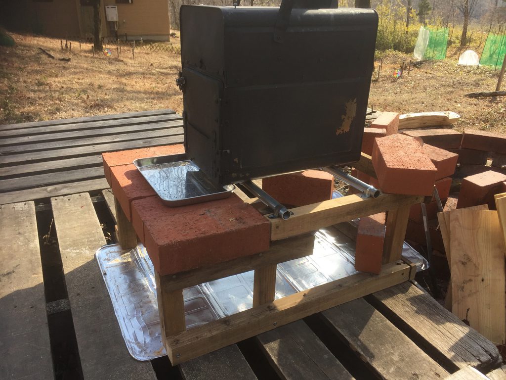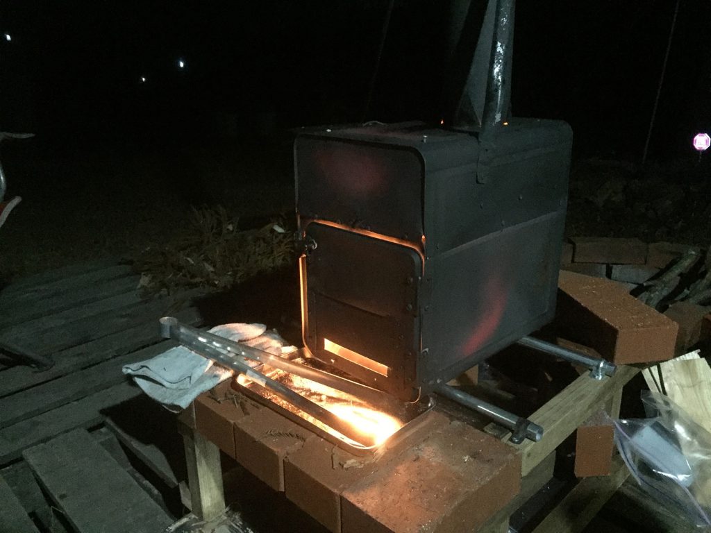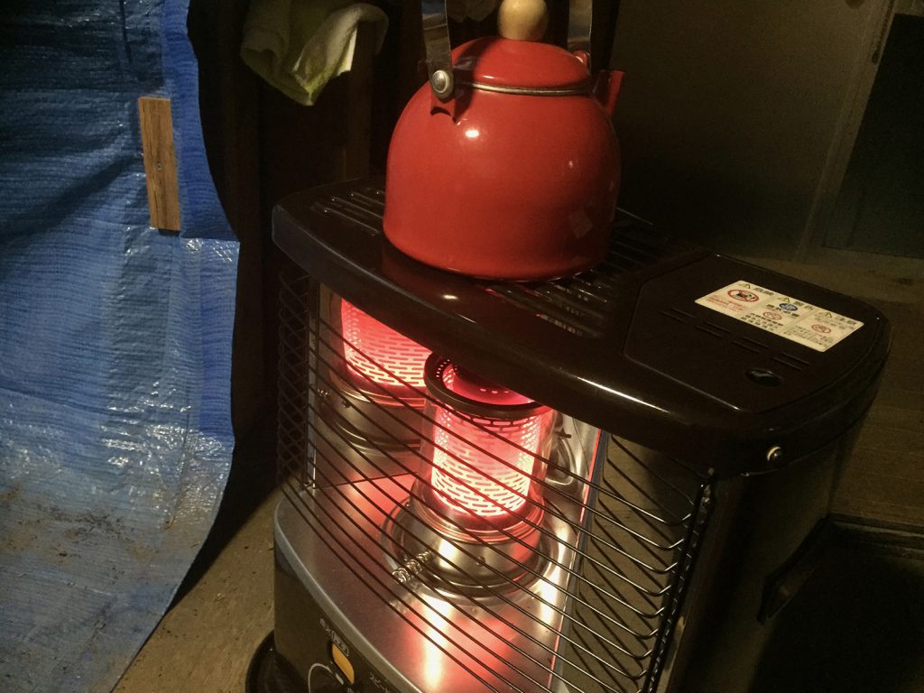 足をつけて高くしたストーブ、暖がちょうどひざから上が温まり、