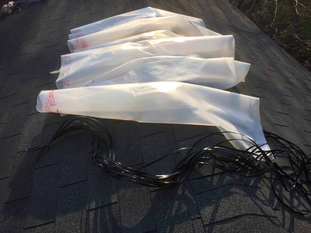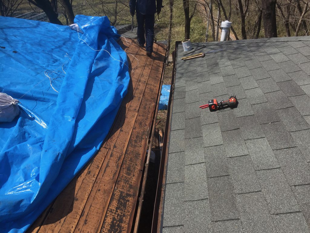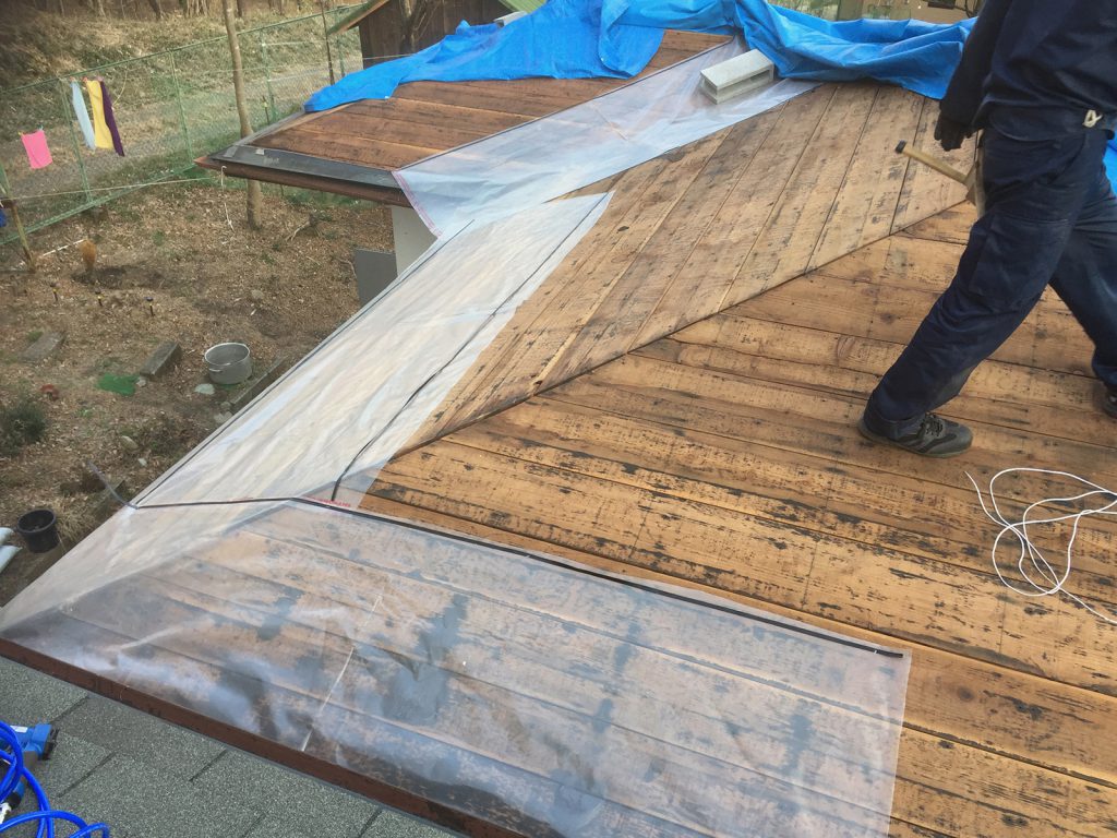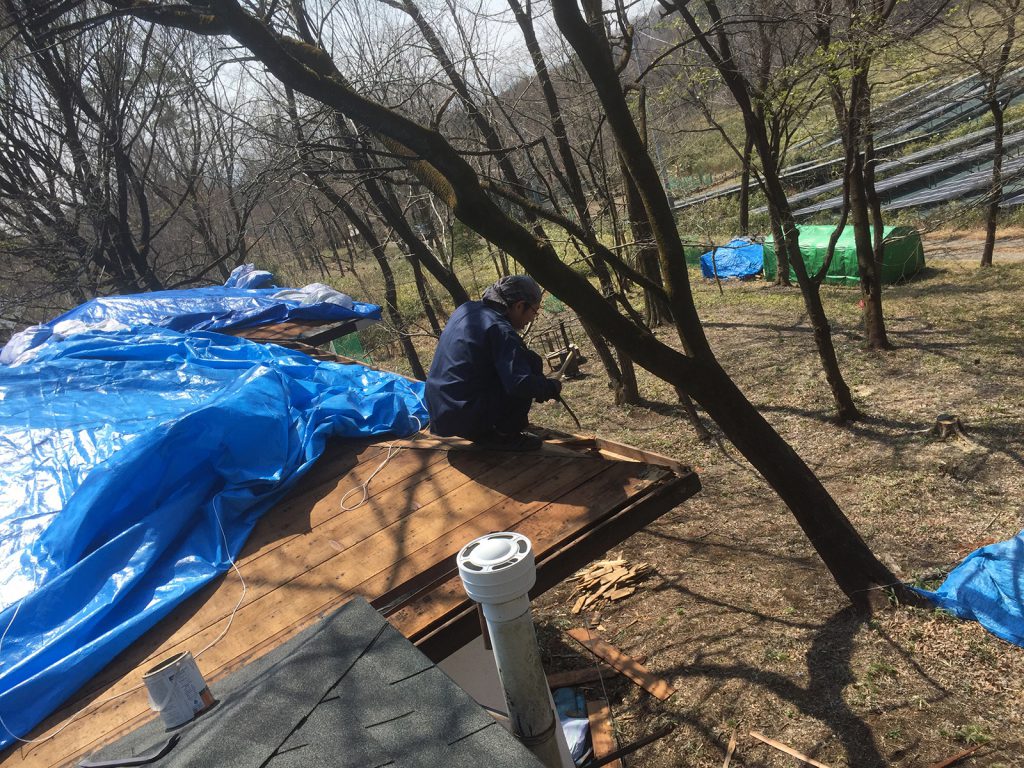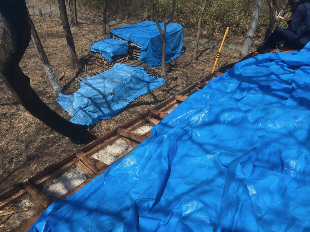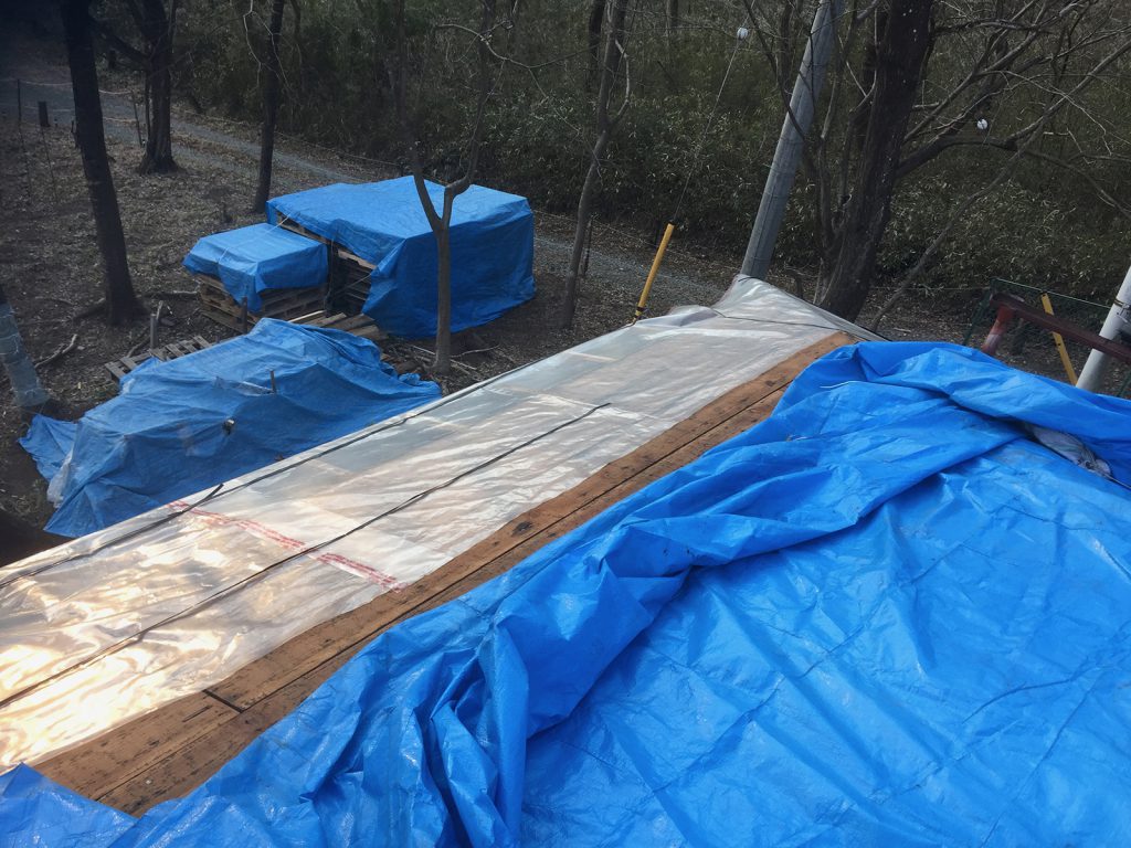さぁ〜てと、簡易防水シート、貼りますかぁ//