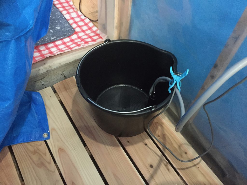 このバケツにお湯を入れて、ホースの水で温度調整デス(;^ω^A)