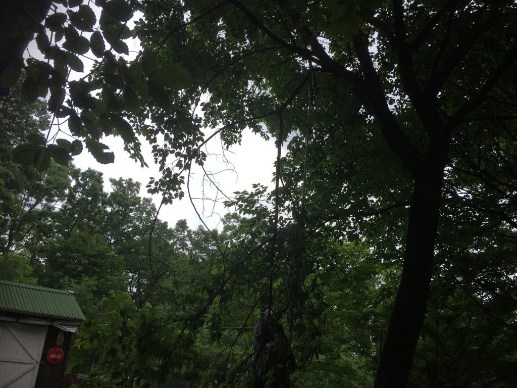屋根に生い茂った木を、高枝ばさみで、切っとります>>>。