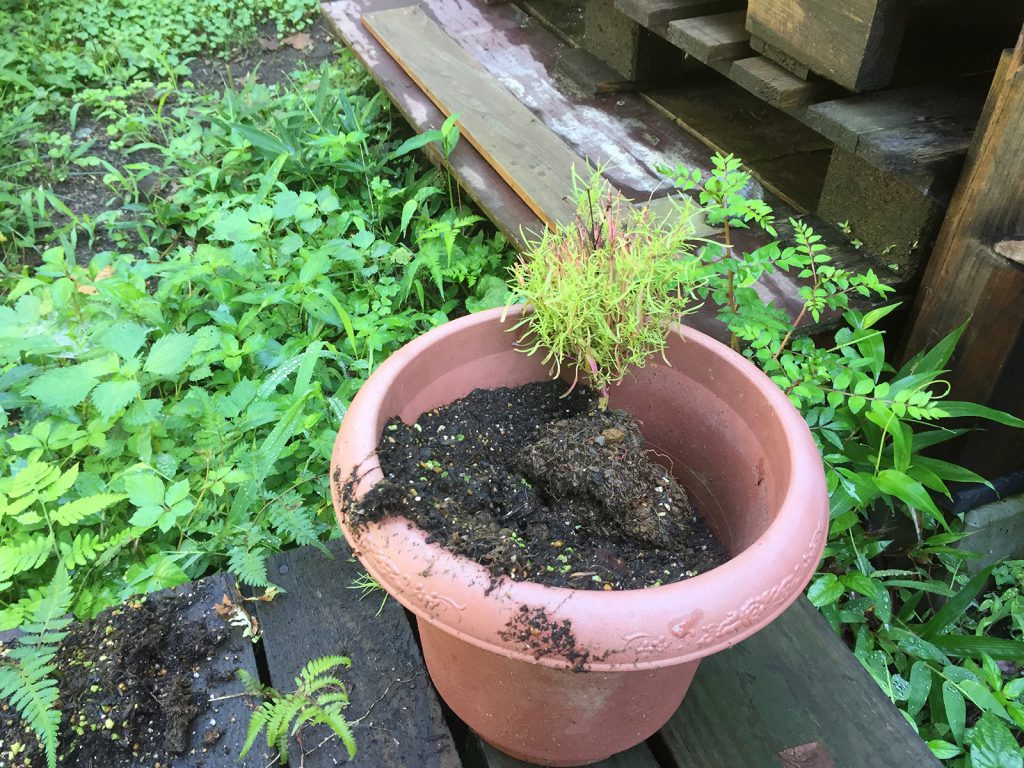 奥のもう1個はこんなに成長してるのに。。。いや!負けないぞ!また植え直してやった..