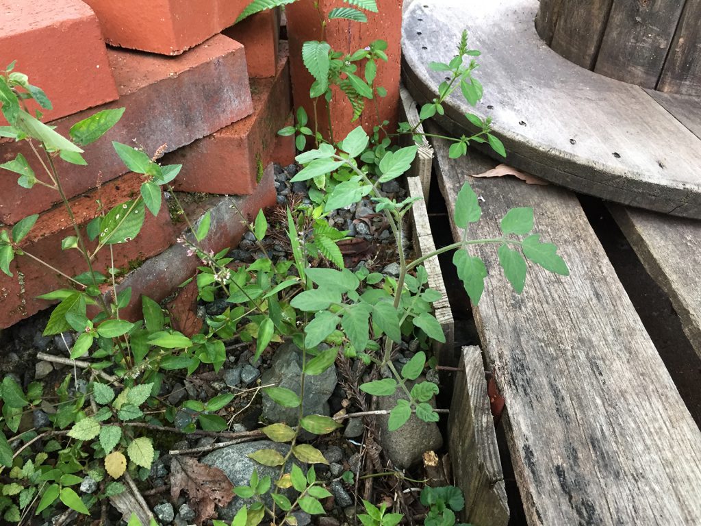 巡回してたら、焚き火台の脇にトマトの苗??(^∇^)なんで・・?