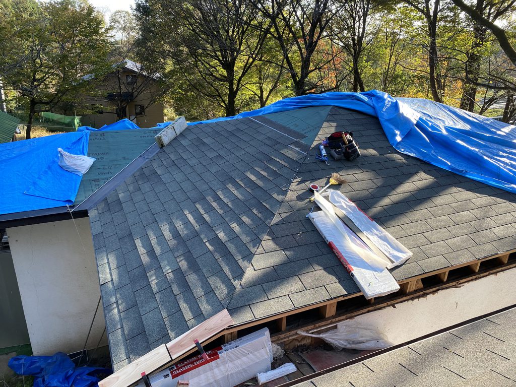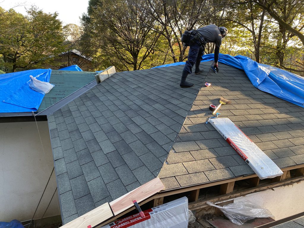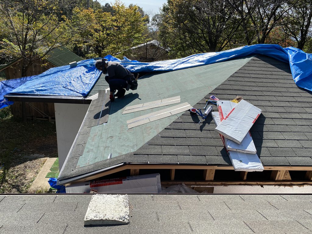 午後の日差しの中、屋根貼り、がんばってるんだけど、、、、