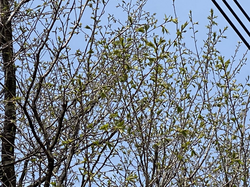 山桜の葉が、わさってまスゥ、、今年は満開見れるか!?<花は数輪、出てるけどね..>