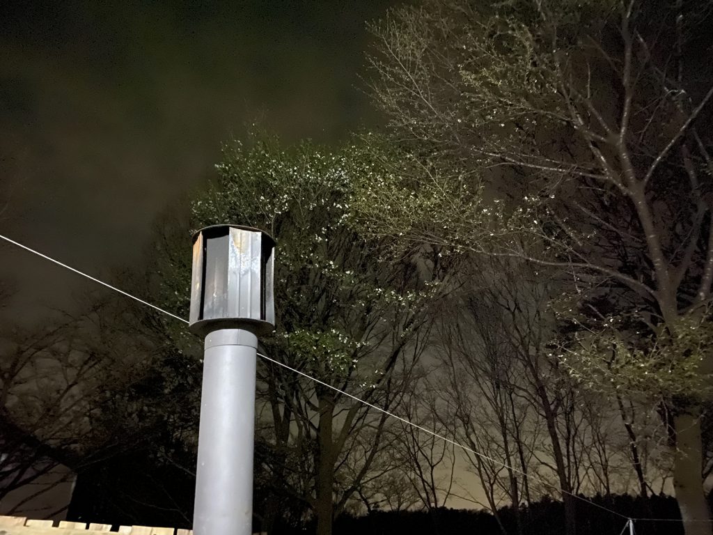 屋根から撮ったら、かなり満開感あり(^-^)/ <上がっては、降りて㏄=┌( ・_・)┘>