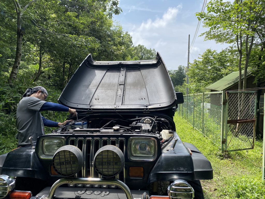 今回来る前から、車両の不調で、買い出し前に、点検と充電です,,。