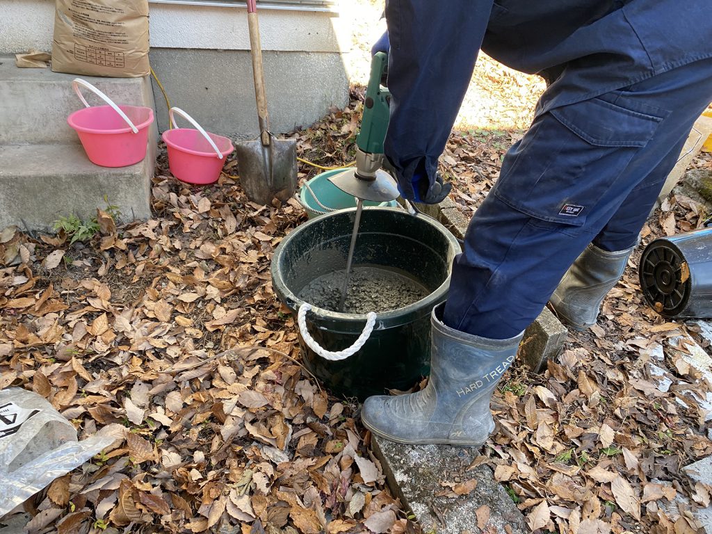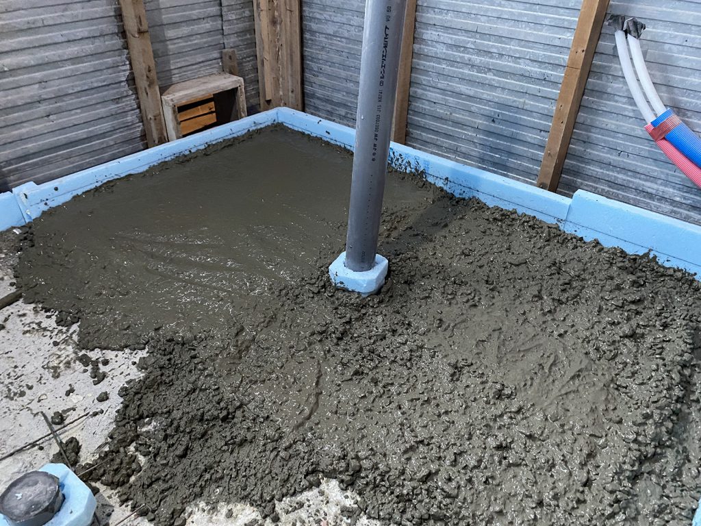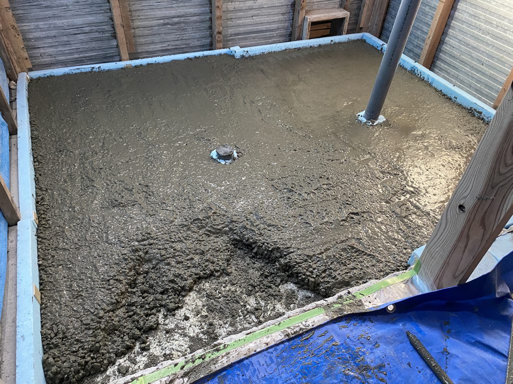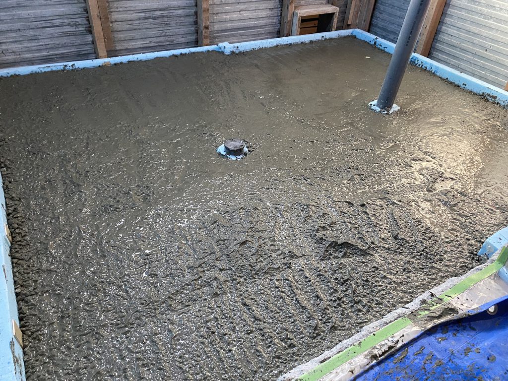 早朝起き、朝イチ作業、コンクリートに仕上げ剤を流して__、