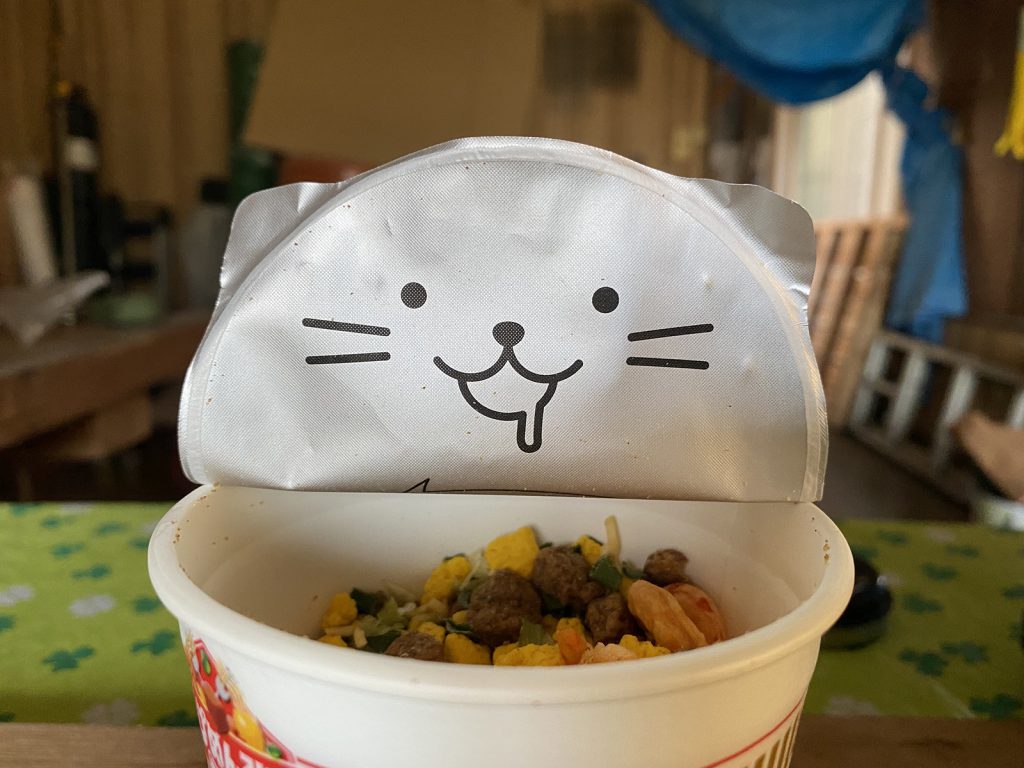 定番ランチのカップ麺、、こんなイラストだったのか^^<2箇所の耳止め、、必ず開くよね,,,>